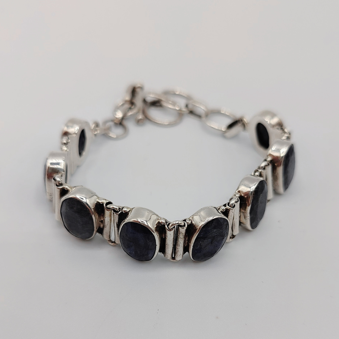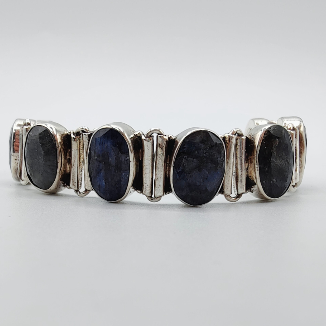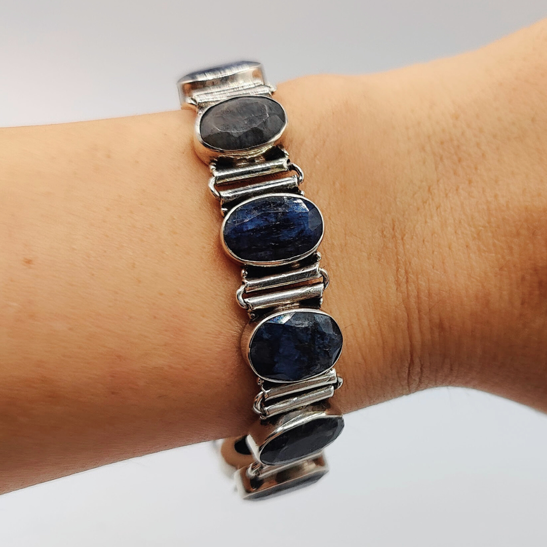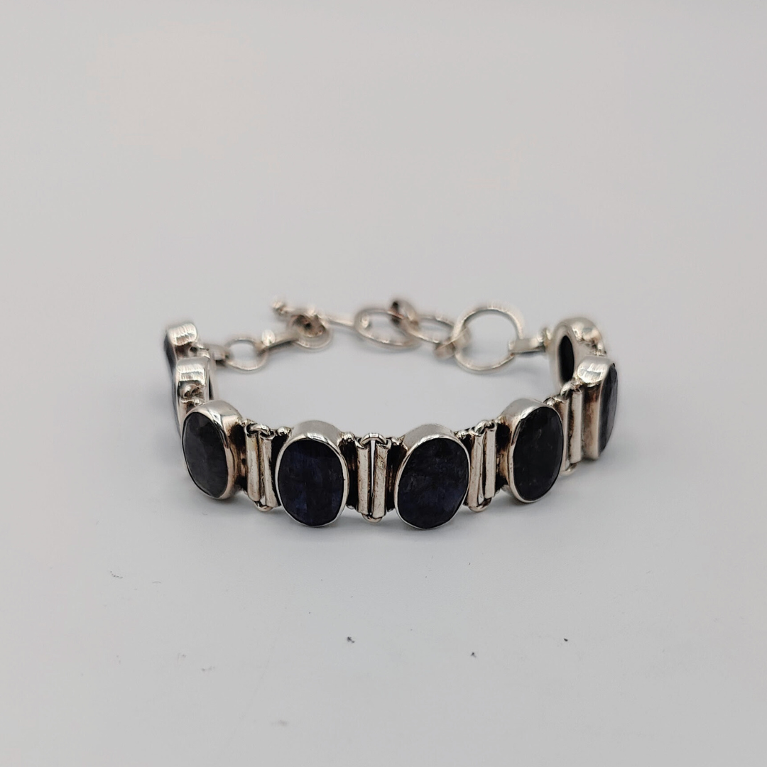 Una pulsera de plata con piedras de dumortierita azul es una joya elegante y distintiva que combina la belleza natural de las piedras con la sofisticación del metal precioso