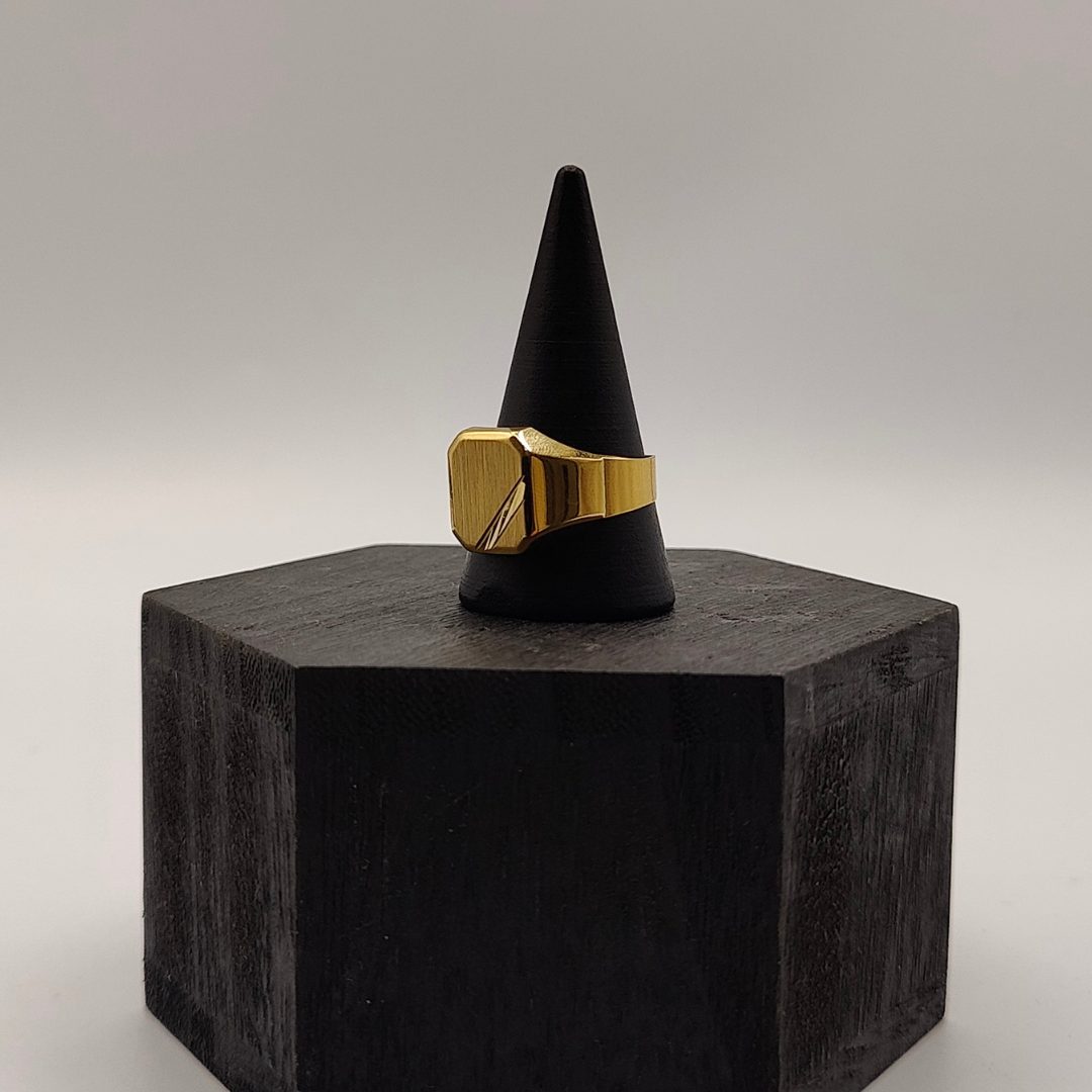 Este anillo sello de oro de 18K es una pieza elegante y audaz. Con su tamaño compacto y forma distintiva, ofrece un toque de sofisticación y personalidad.