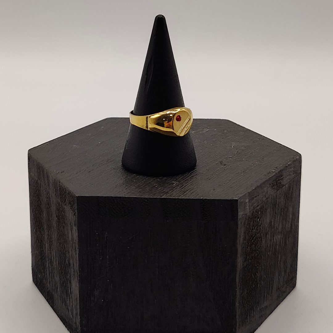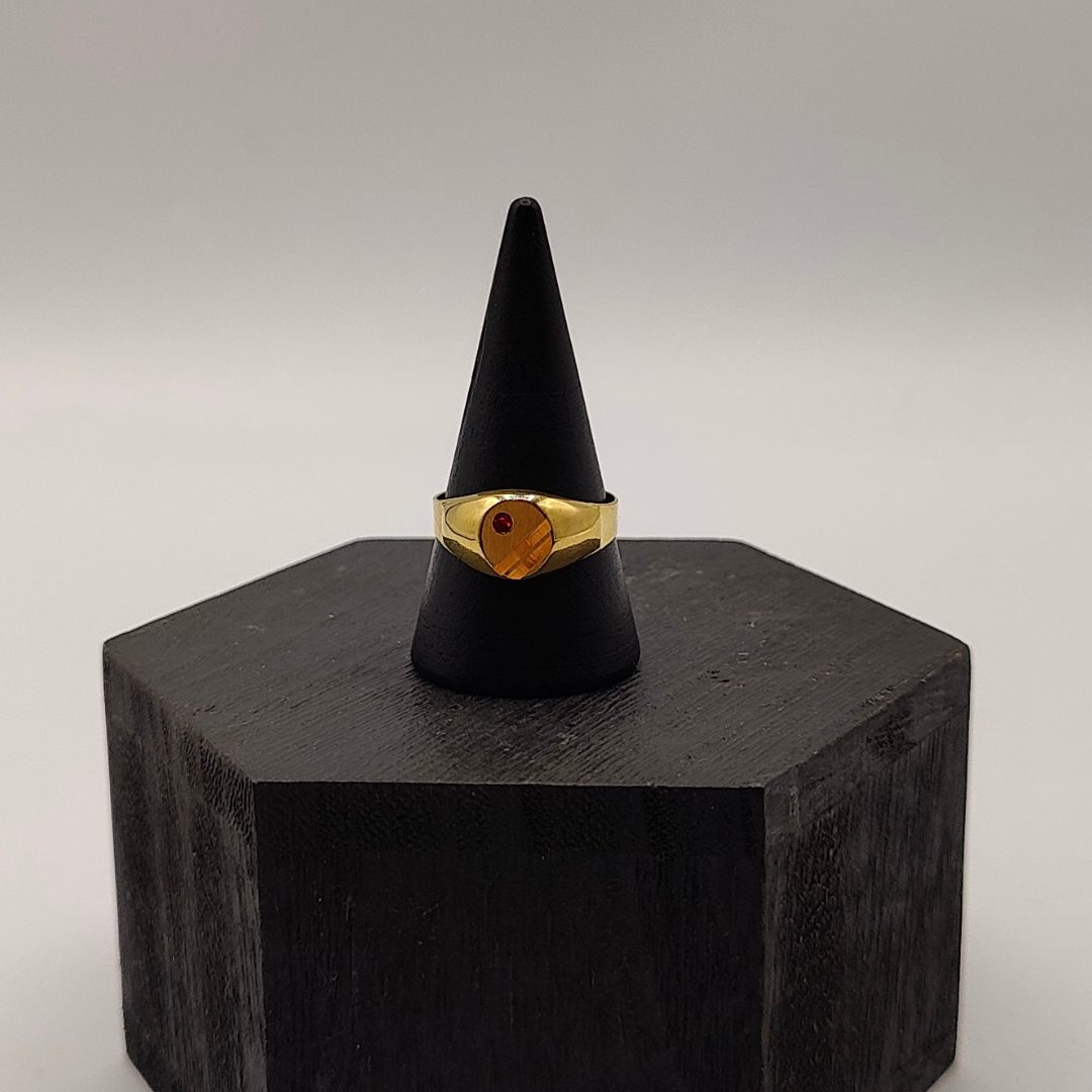 Este anillo sello redondo en oro de 18K es una joya elegante y llamativa, diseñada especialmente para lucir en el meñique. En su centro, una circonita roja.