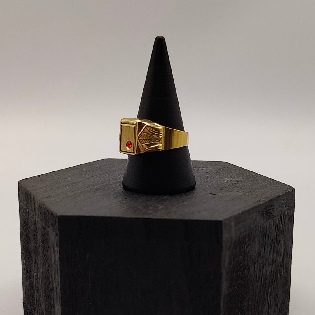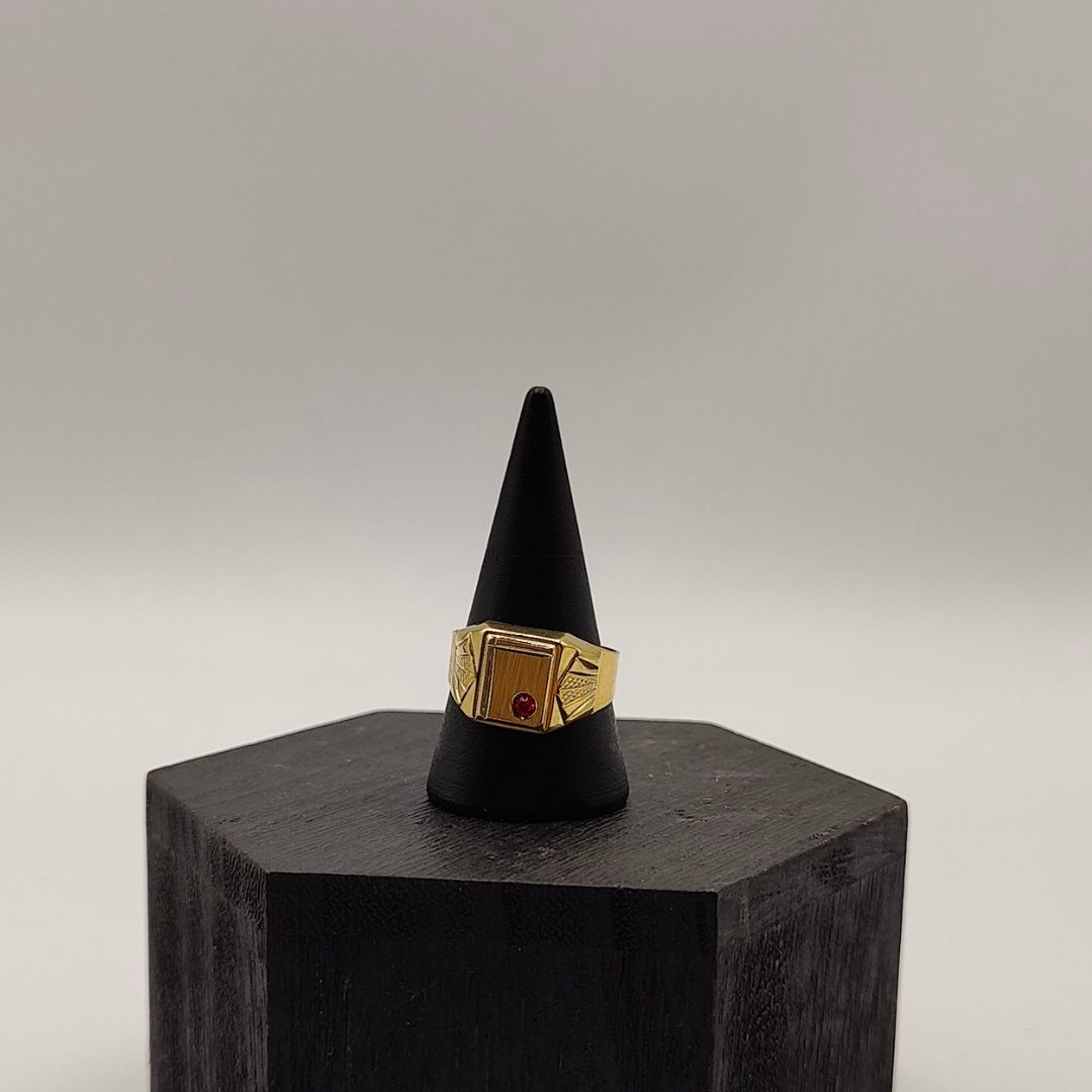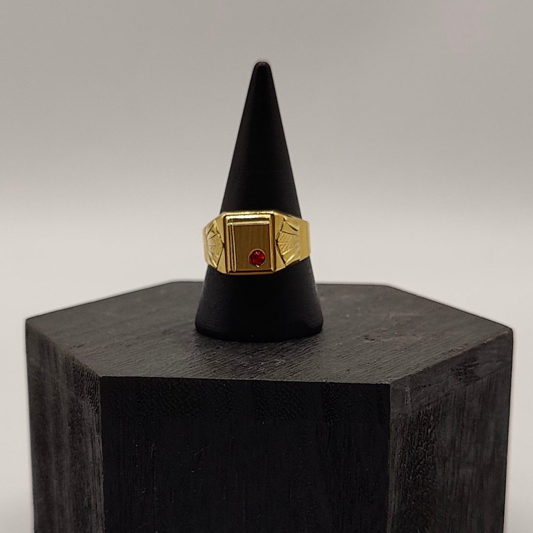 Este anillo sello en oro de 18K es una pieza elegante y sofisticada que captura la atención con su diseño distintivo. En el centro, una circonita roja brilla intensamente