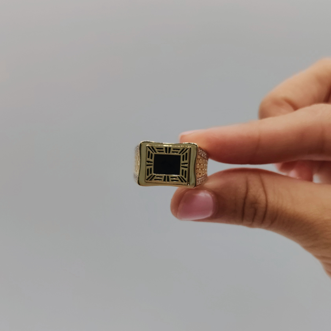 Un anillo de sello rectangular con azabache y circonitas en los costados, elaborado en oro de 18 quilates, es una pieza de joyería