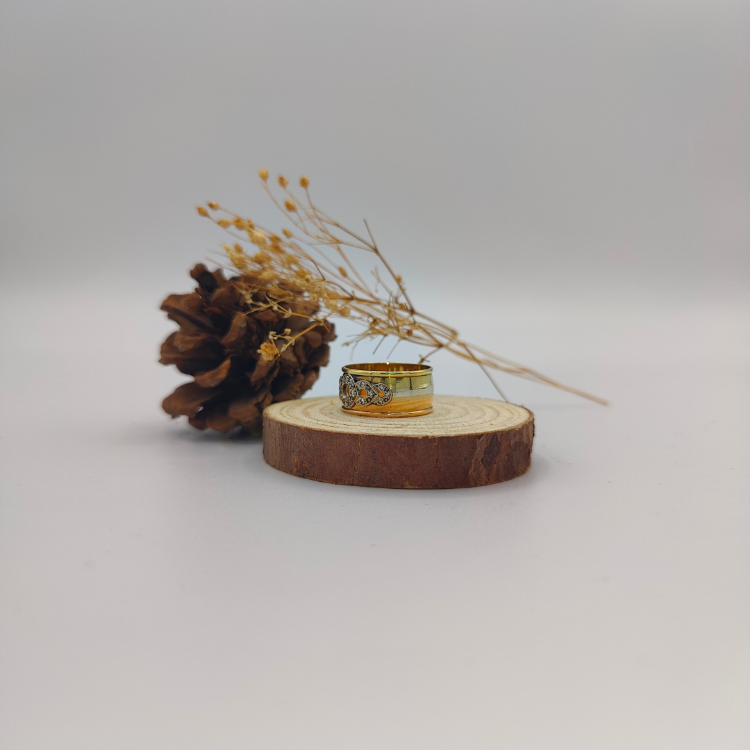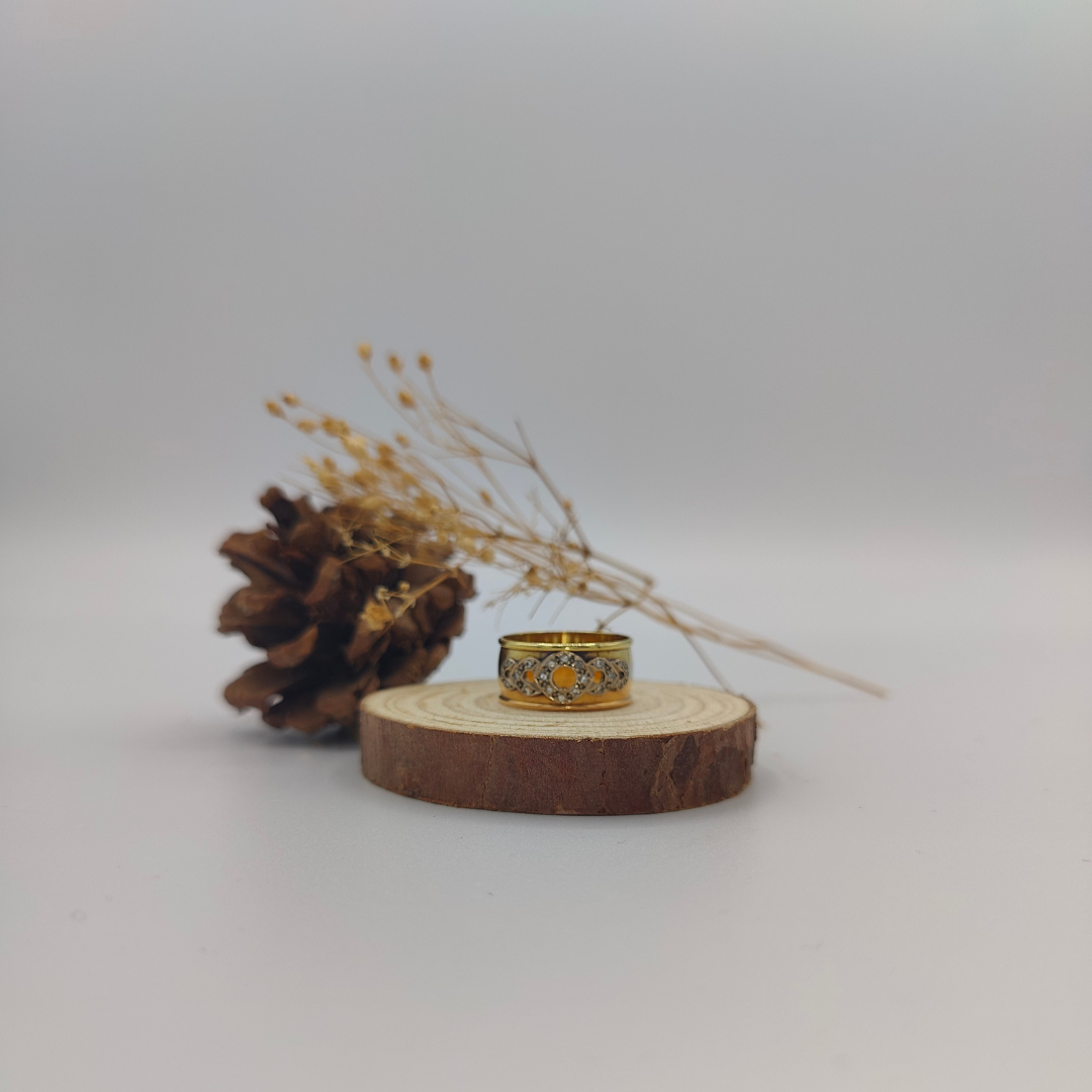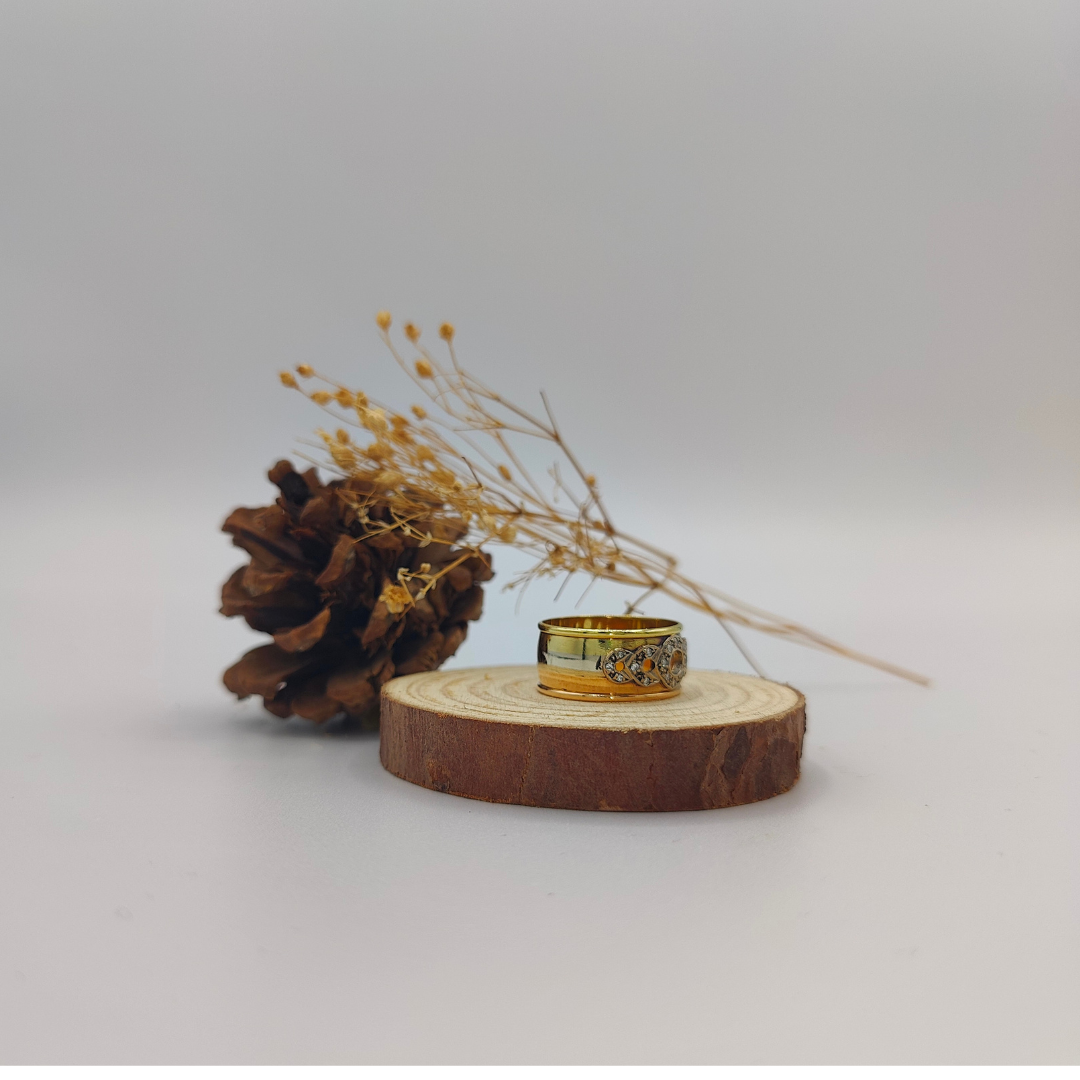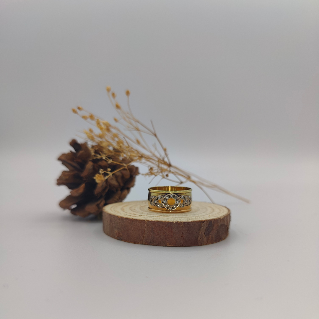 Este imponente anillo de oro emana elegancia y lujo con su diseño audaz y sofisticado. El anillo de oro resplandece con un brillo cálido y duradero, mientras que en su superficie están incrustado una serie de círculos de diamantes, que añaden destellos de luz y glamour. Estos diamantes brillantes están meticulosamente engastados, creando un efecto deslumbrante que captura la atención de todos los que lo ven. Este anillo es una declaración de estilo atemporal y refinamiento, perfecto para aquellos que desean destacar con elegancia y distinción.