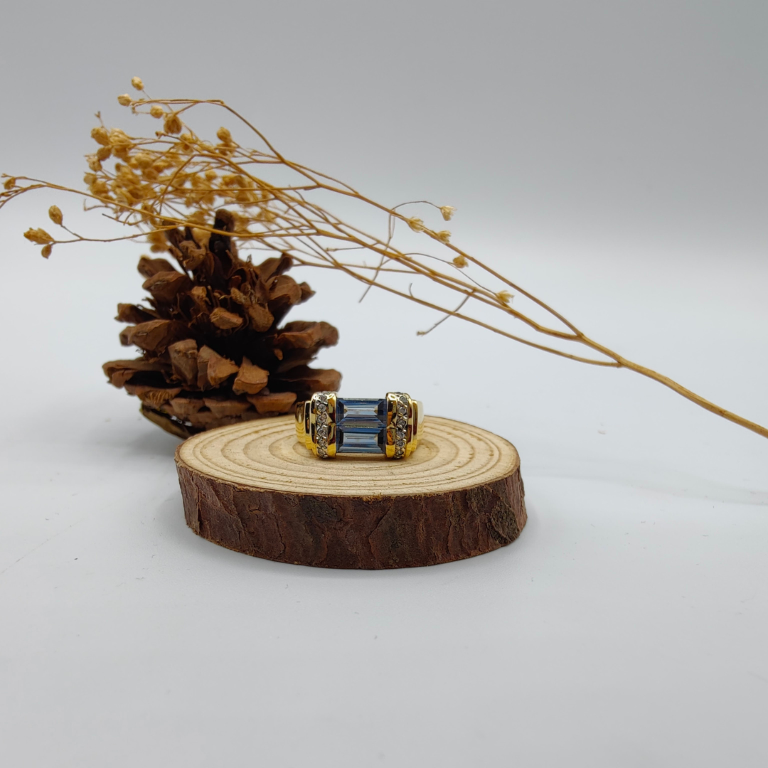 Un exquisito anillo con una piedra aguamarina central rodeada de circonitas, montado en oro aportando así un toque de elegancia.