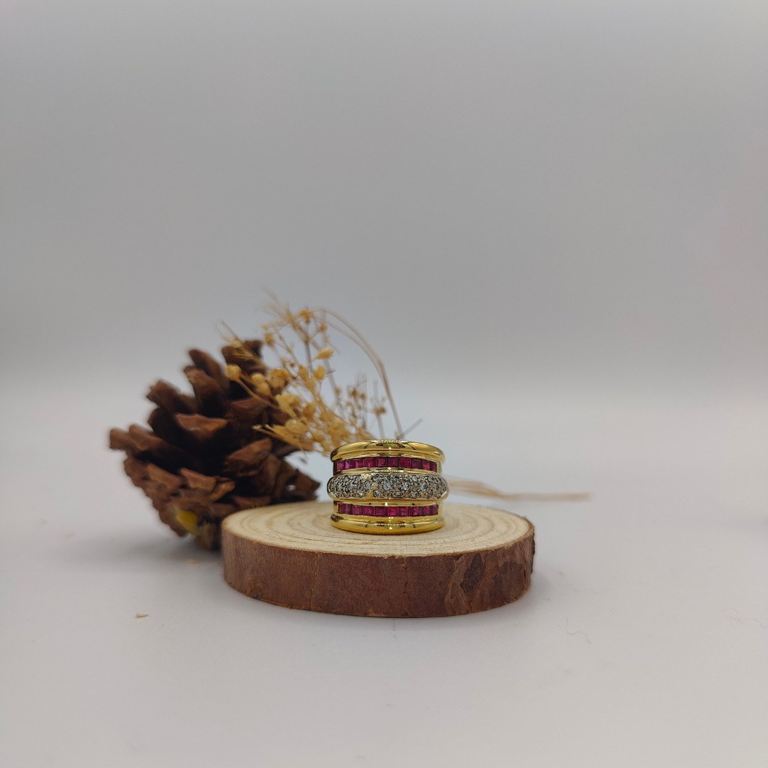 Este deslumbrante anillo presenta una fila central de diamantes que capturan la luz con un brillo deslumbrante. Por encima y por debajo de los diamantes,  se encuentran filas de rubís rojos intensos, todos ellos engastados en un elegante anillo de oro. Esta combinación de diamantes y rubís crea un contraste cautivador entre el brillo inmaculado y el intenso color rojo, haciendo de este amillo una verdadera declaración de estilo y sofisticación.