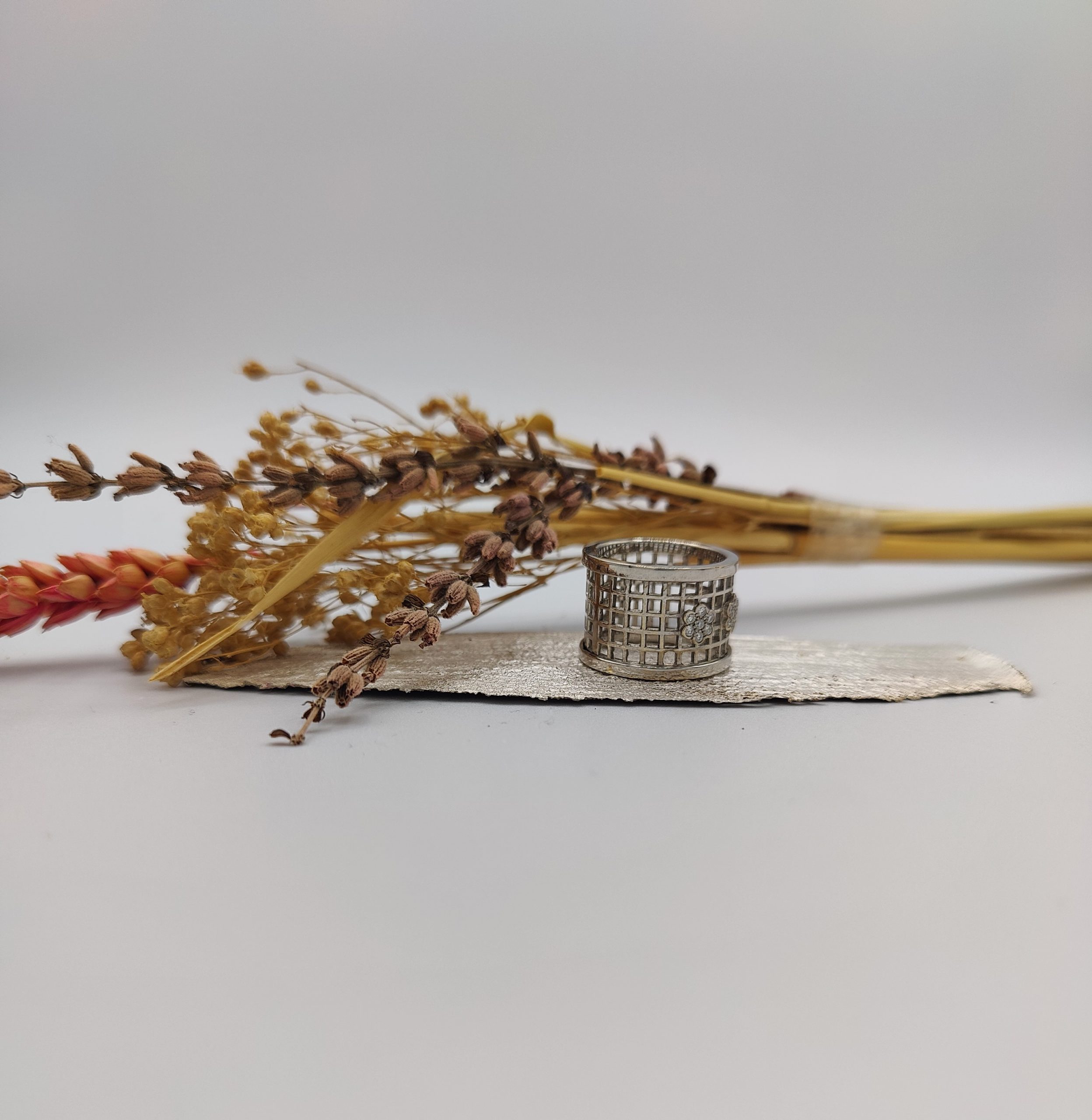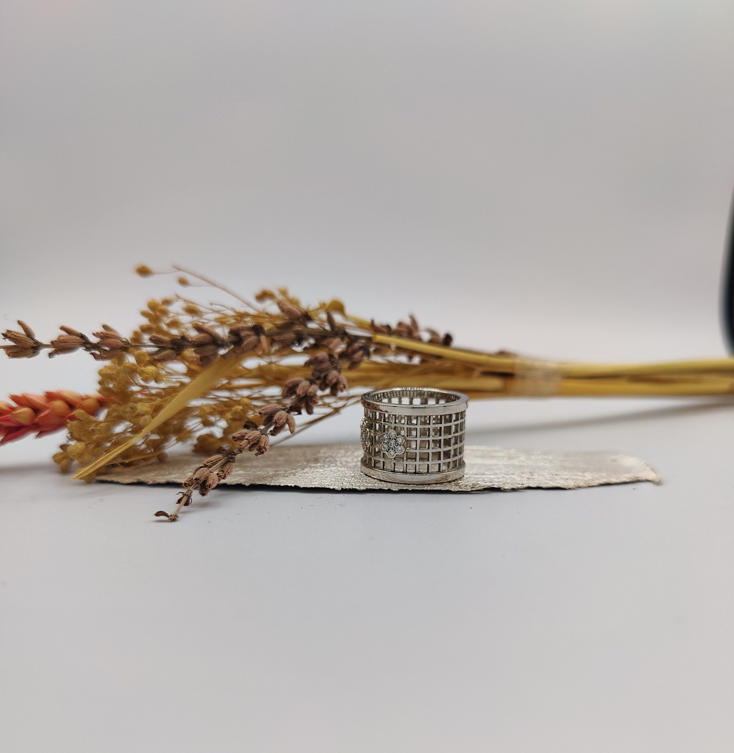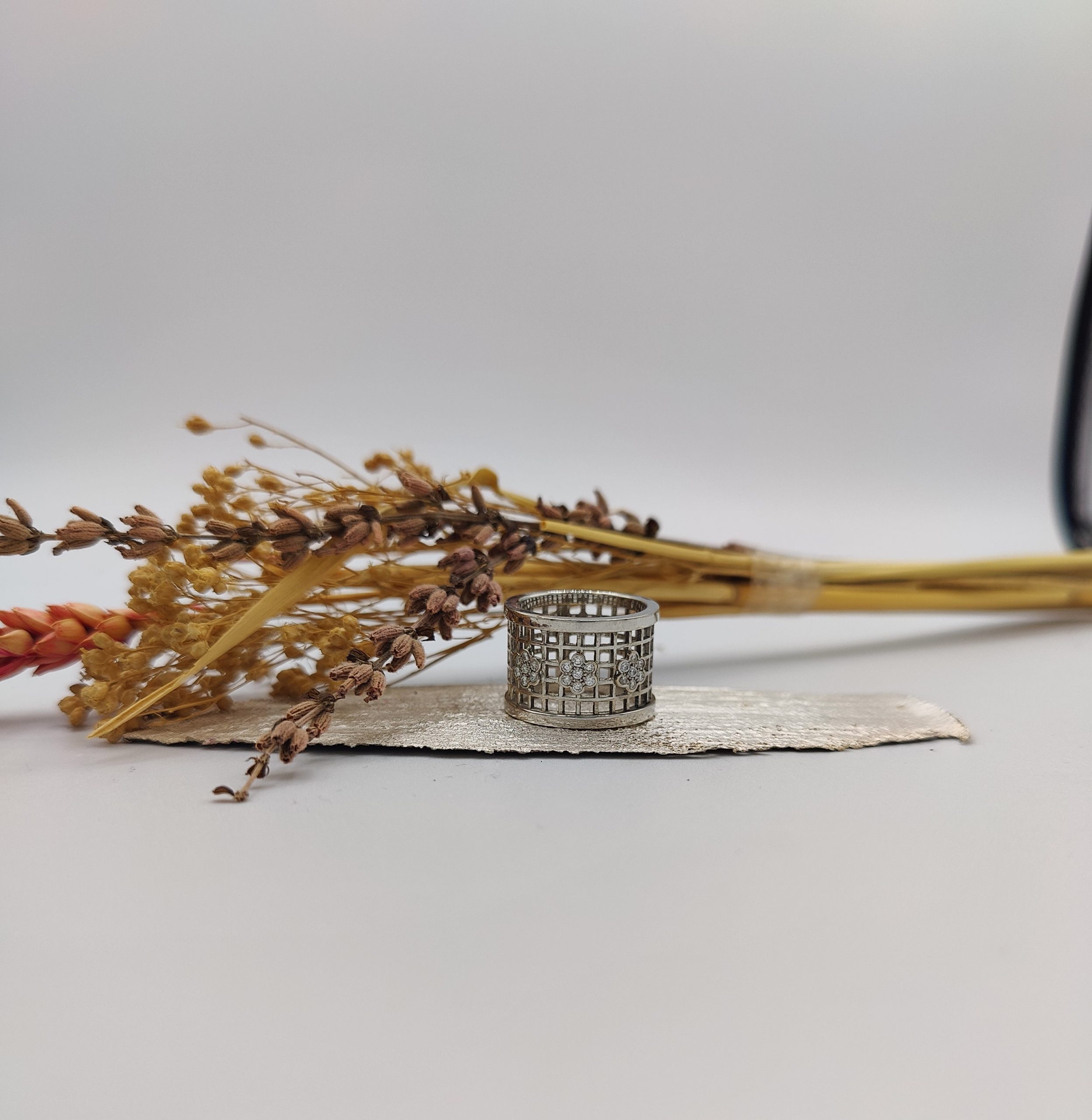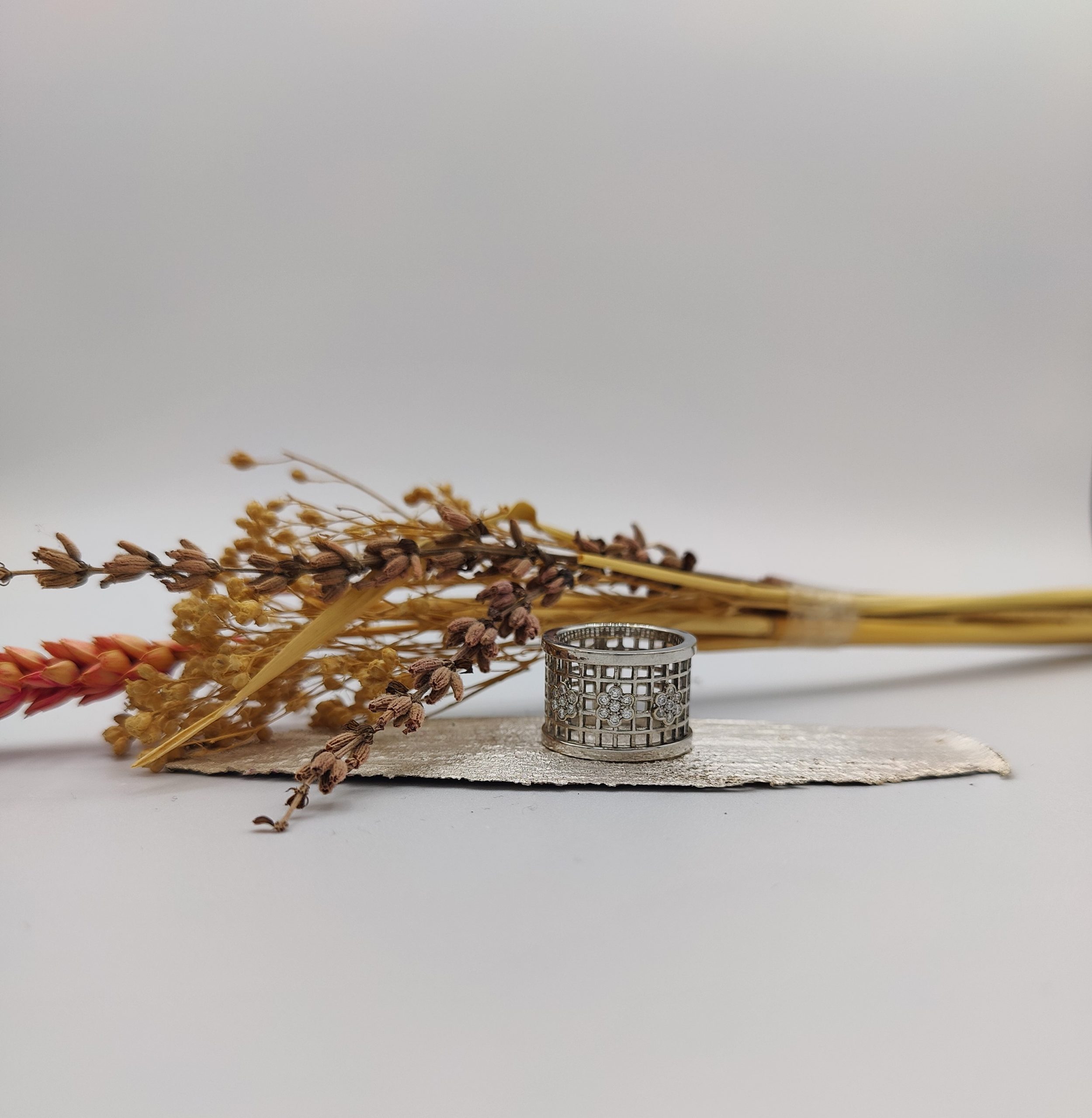 Este encantador anillo presenta un diseño único con agujeros cuadrados que le confieren un aire moderno y distintivo. En su superficie, tres delicadas flores están meticulosamente dibujadas, cada una adornada con diamantes brillantes que añaden un toque de glamour y sofisticación.