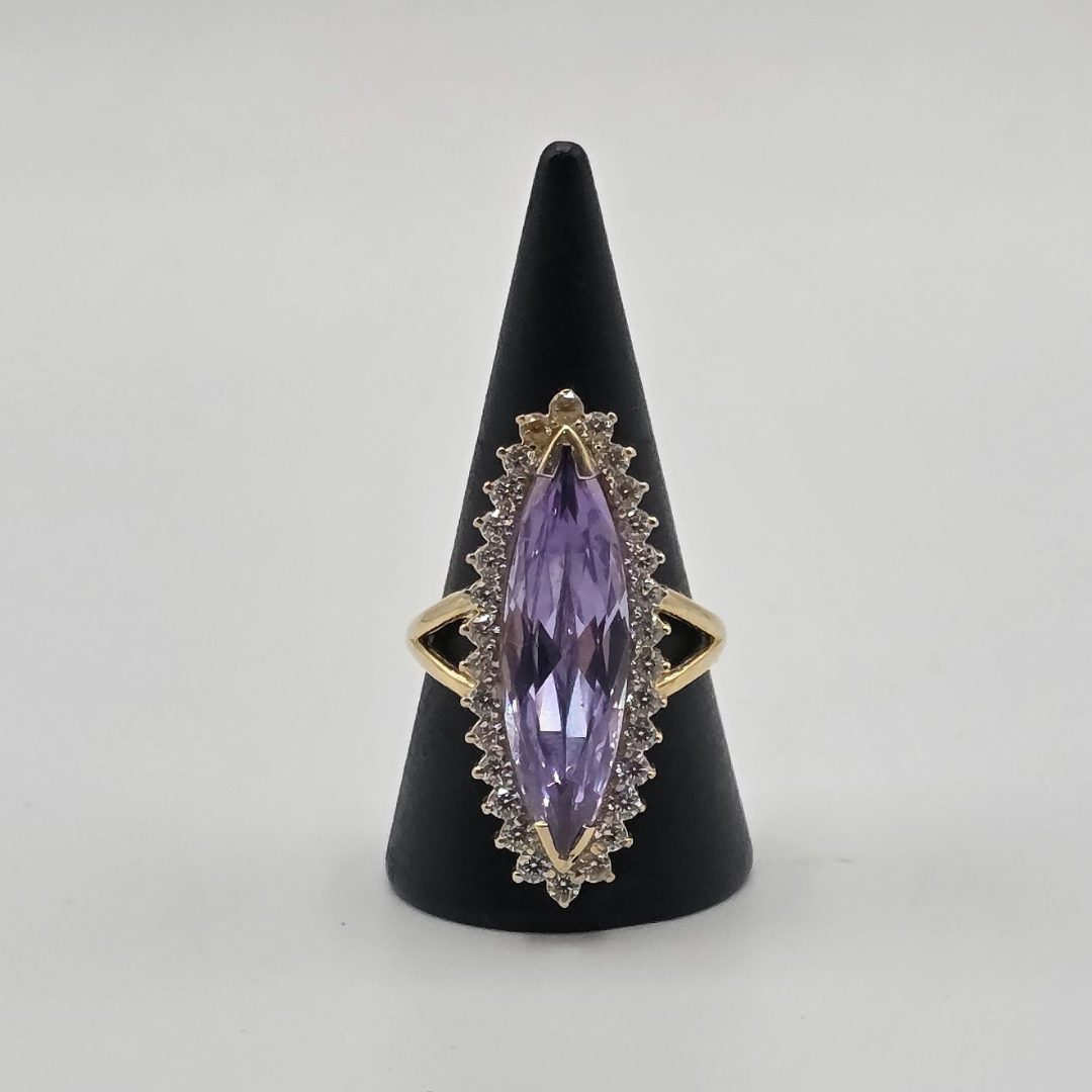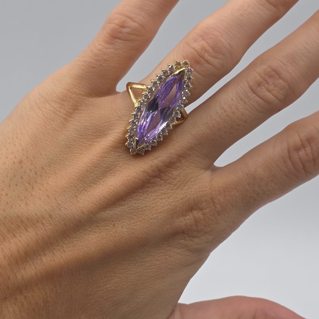 Este anillo estilo lanzaderas destaca por su diseño fino y moderno, con una circonita lila central que aporta un toque de color sutil y sofisticado.