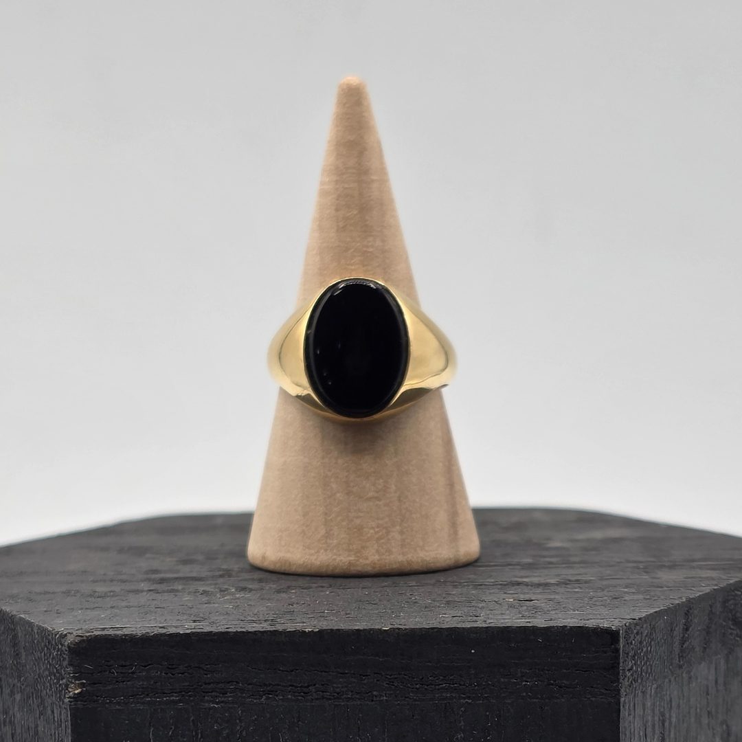 Este anillo sello en oro de 18 quilates presenta una elegante forma ovalada, con una impactante piedra de ónix negra en el centro. La profundidad y el brillo del ónix