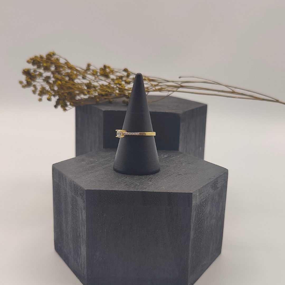 Este anillo solitario de oro de 18K es una pieza deslumbrante que combina elegancia y sofisticación. Circonita de gran tamaño captura toda la atención.