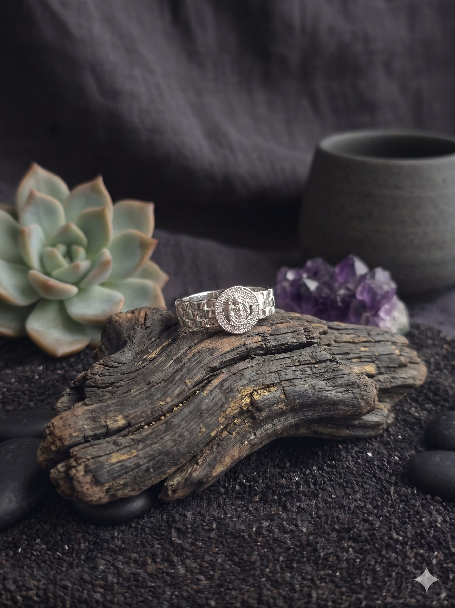 En el corazón del anillo se encuentra una figura de cabeza de Medusa, inspirada en el icónico estilo Versace, que añade un toque distintivo y de alto impacto visual. Su peso ligero de 5,4 gramos lo hace cómodo para el uso diario sin renunciar a su carácter.