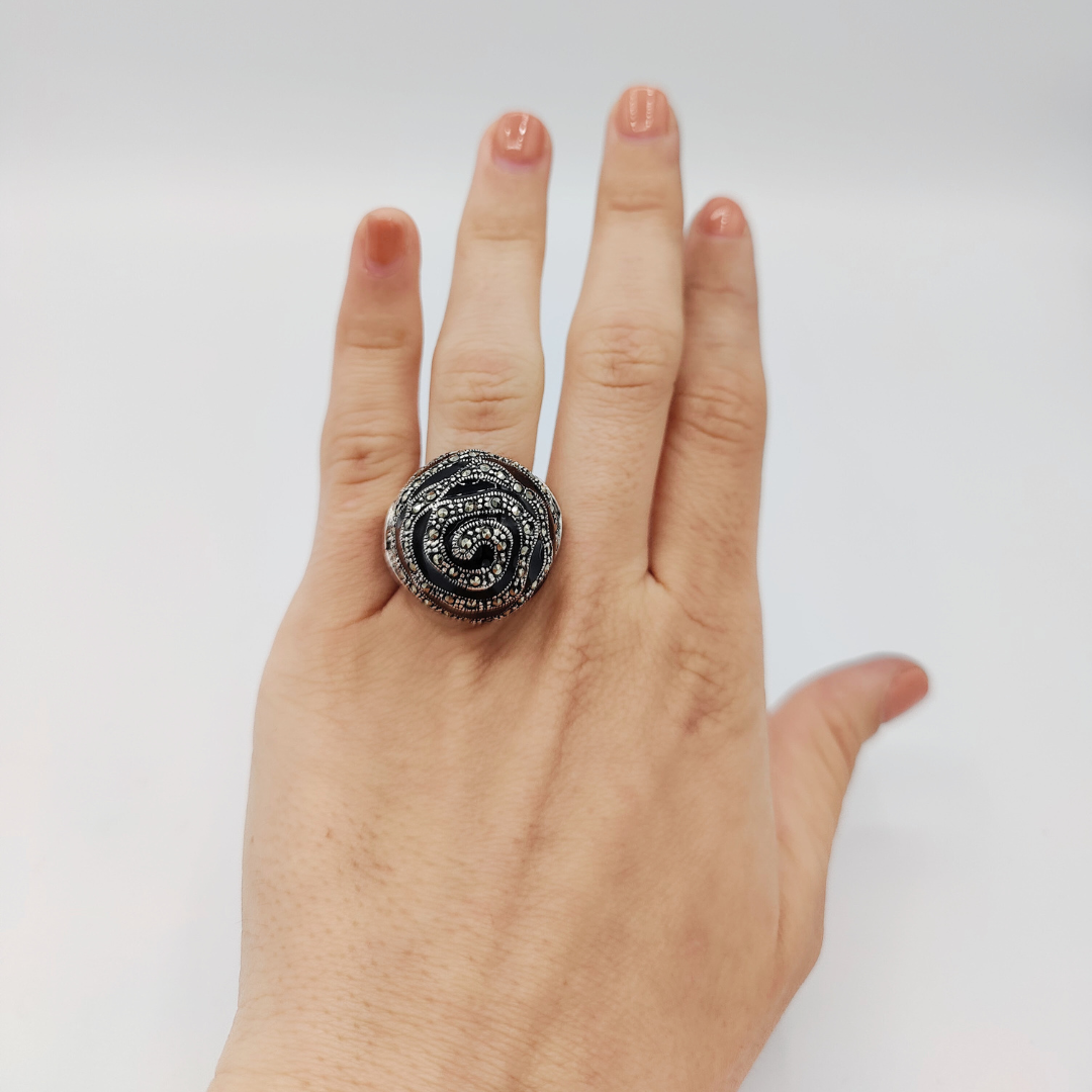 Imagina un elegante anillo bombé esmaltado al fuego, con tonos negros y verdes que se entrelazan en un diseño cautivador. Las marquesitas, pequeñas piedras preciosas facetadas, están incrustadas en el esmalte, añadiendo destellos sutiles y elegantes al conjunto.