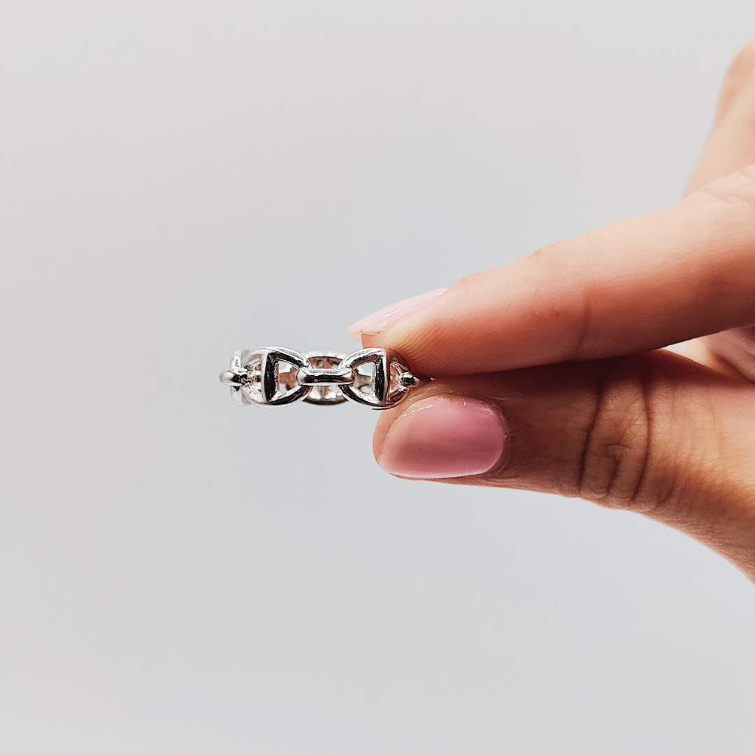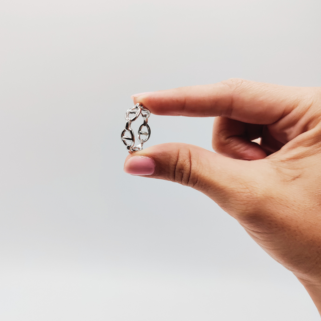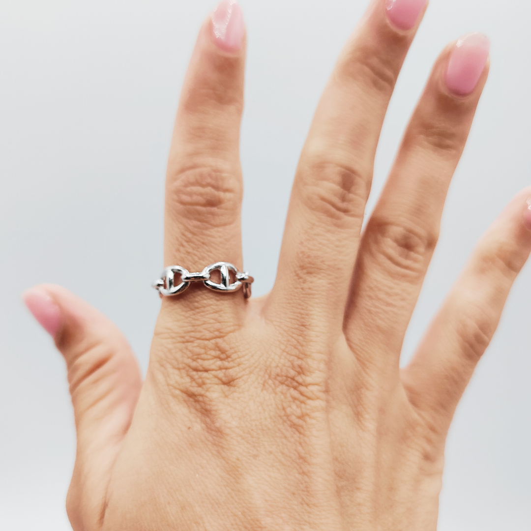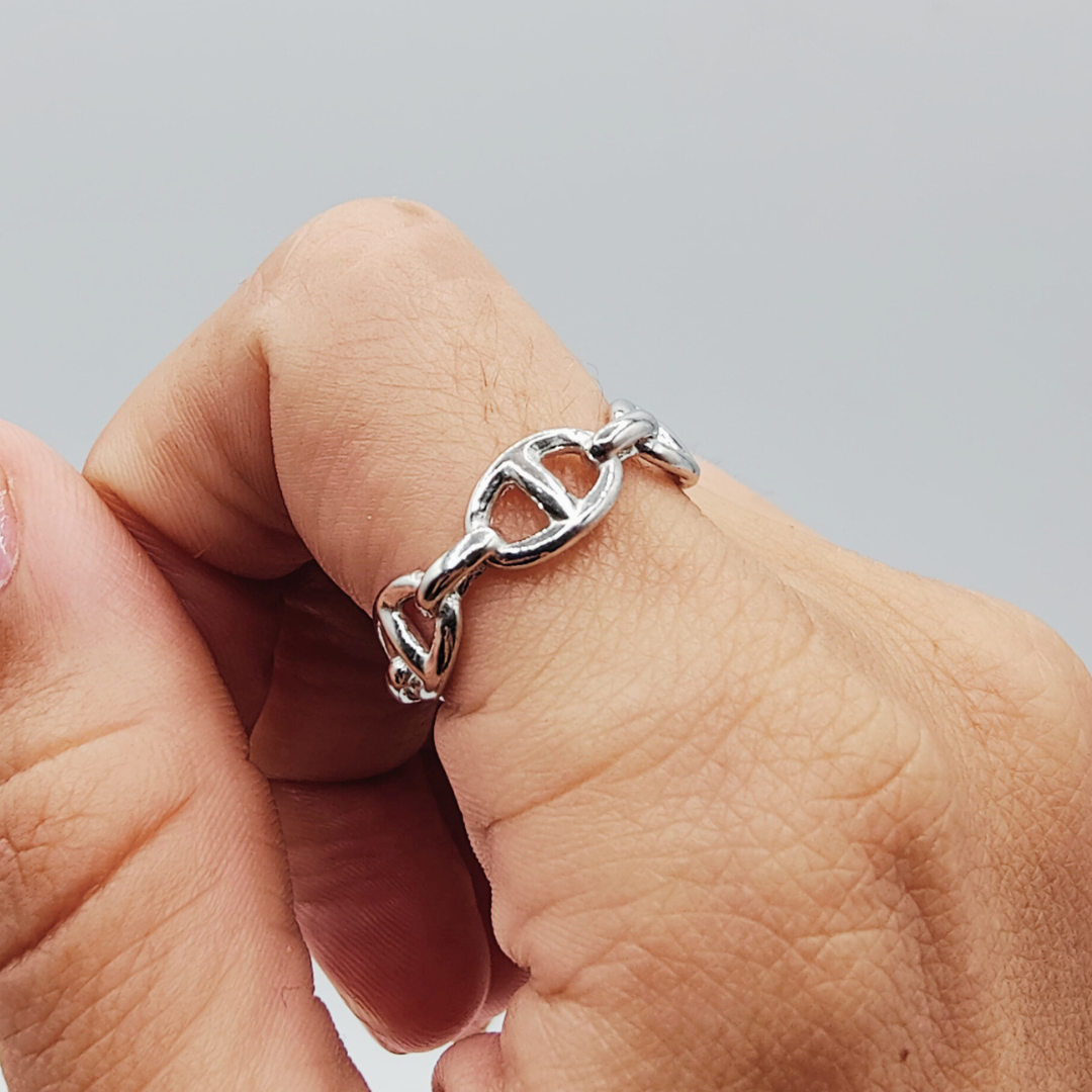 Este anillo de plata de ley destaca por su diseño calabrote, evocando una elegancia robusta y un estilo náutico distintivo. La forma calabrote, inspirada en los eslabones de cadenas marineras, se presenta de manera elegante y contemporánea, con un acabado pulido que resalta la belleza intrínseca de la plata. Su estructura sólida y su diseño único lo convierten en una pieza versátil, ideal para añadir un toque de sofisticación tanto a looks casuales como formales. Perfecto para quienes aprecian la combinación de tradición y modernidad, este anillo es una declaración de estilo y buen gusto.