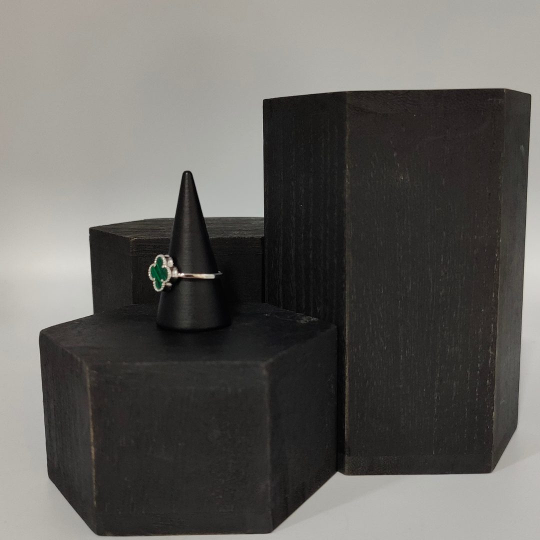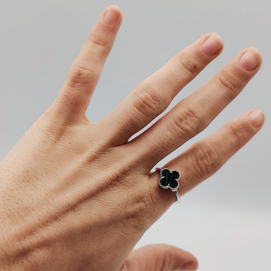Descubre la belleza atemporal con este anillo de plata con flor Van Cleef y piedra malaquita . Su diseño icónico y su exquisita combinación de materiales lo convierten en una joya única y especial.