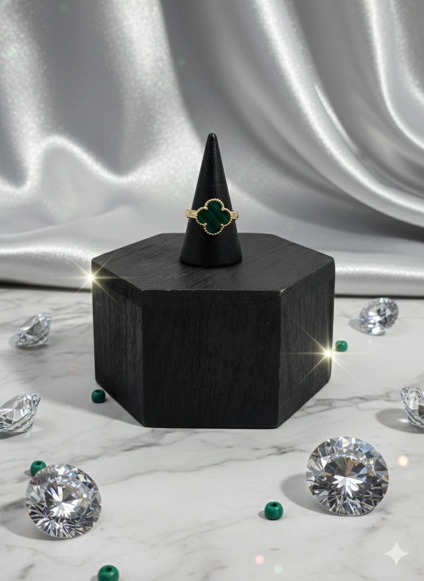 Este elegante anillo de plata dorada inspirado en el icónico diseño Van Cleef es la pieza perfecta para quienes buscan un accesorio sofisticado y moderno. Su acabado en plata bañada en oro aporta un brillo cálido y lujoso, mientras que la piedra malaquita ofrece un contraste espectacular con sus tonos verdes intensos y vetas naturales.
