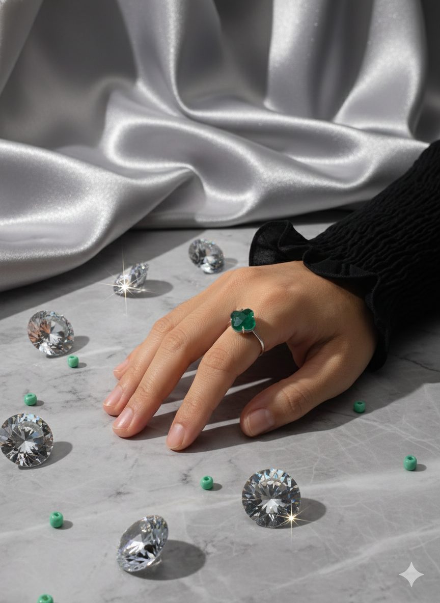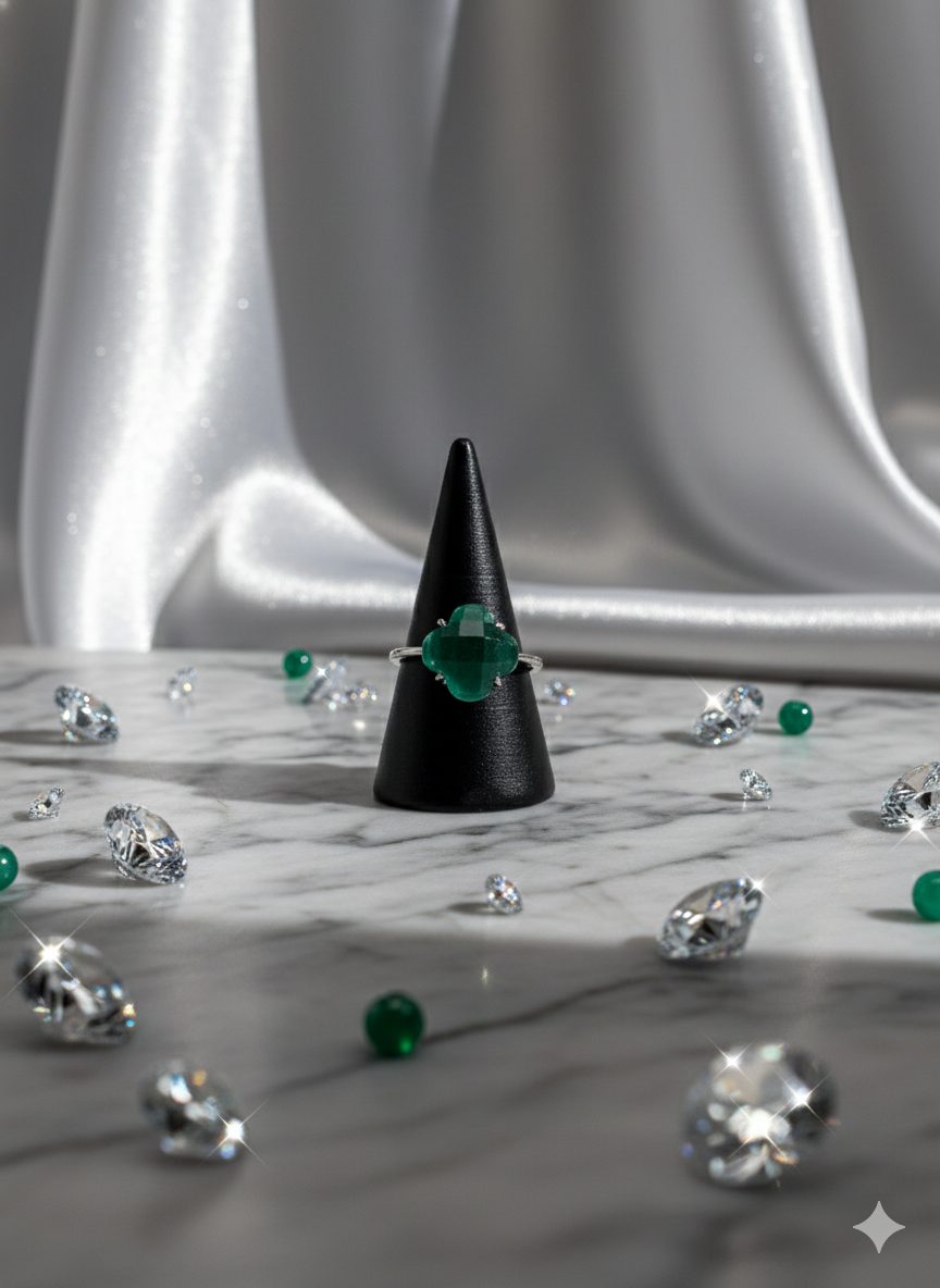 Aporta un toque de elegancia y color a tu estilo con este anillo de plata inspirado en el icónico diseño Van Cleef, una joya delicada y sofisticada que destaca por su clásico motivo de trébol. Fabricado en plata de alta calidad, su acabado pulido realza el brillo de la circonita verde, una piedra luminosa que aporta frescura y distinción.