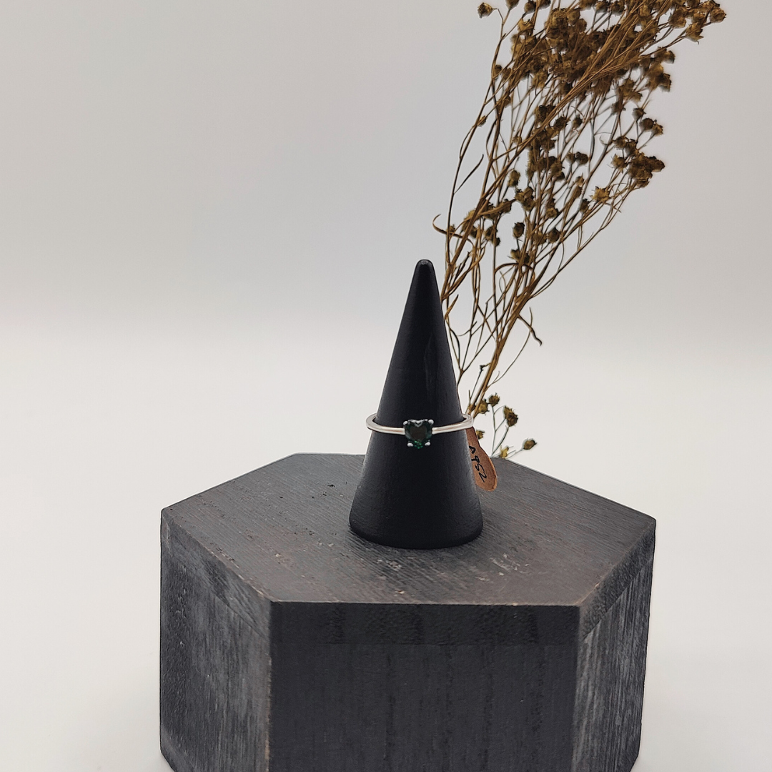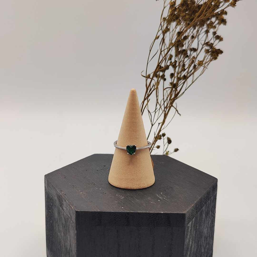Este encantador anillo de plata extensible es una pieza versátil y elegante, diseñada para adaptarse cómodamente a cualquier dedo. Con una circonita en forma de corazón verde.