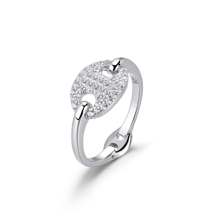 Este sofisticado anillo de plata de ley 925 rodiada destaca por su original diseño calabrote, símbolo de unión y fuerza. Decorado con circonitas.