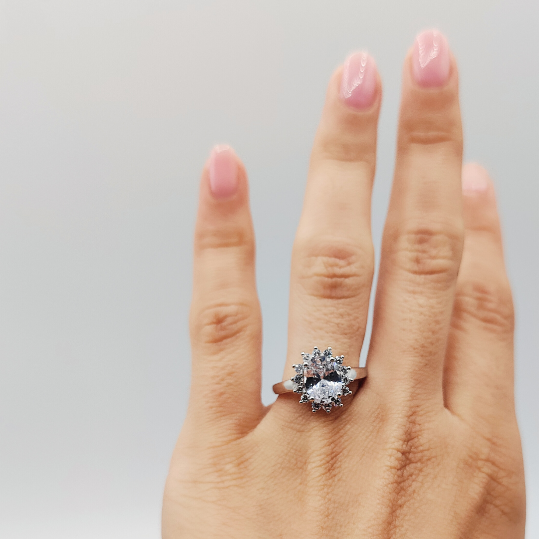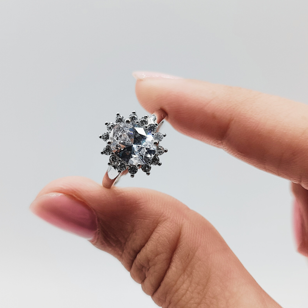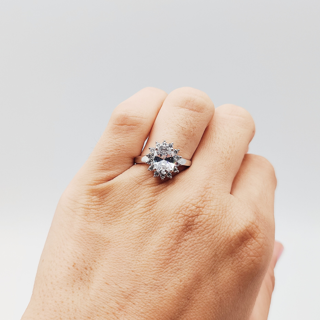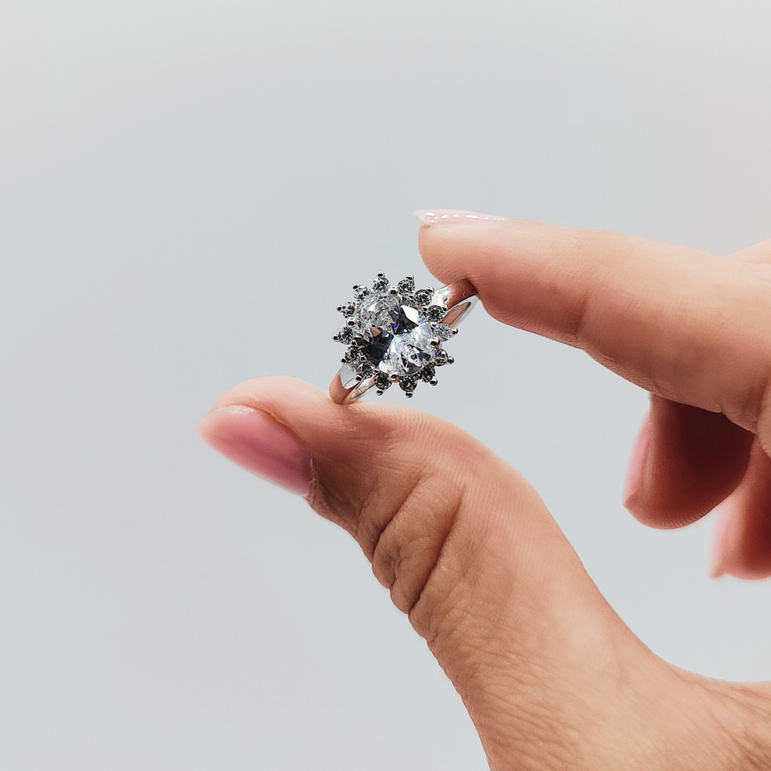 Este anillo presenta un diseño floral deslumbrante que irradia elegancia y feminidad. En el centro, una gran circonita captura la luz y se convierte en el foco de atención