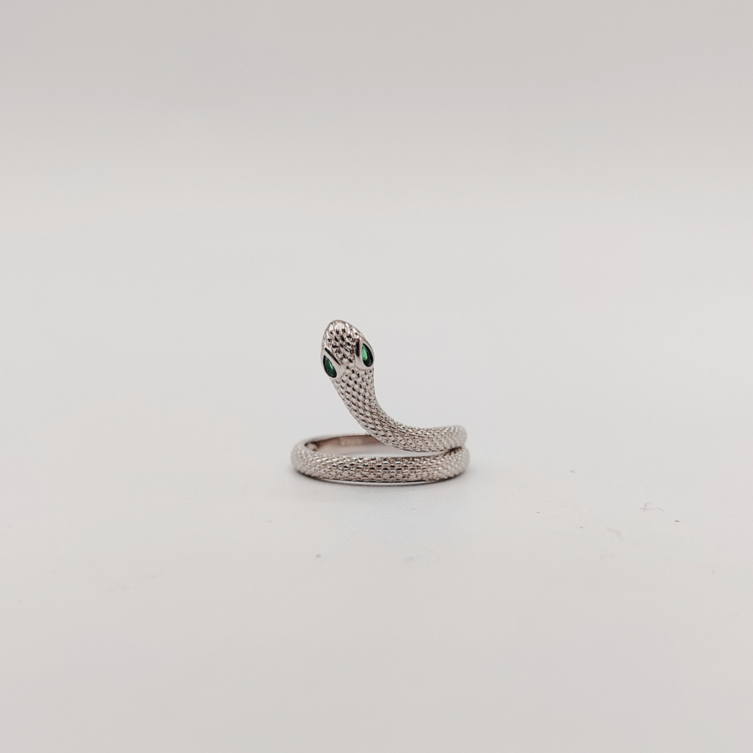 Este anillo evoca la esencia de la naturaleza salvaje con su diseño intrincado y detallado. La forma sinuosa de la serpiente, cuidadosamente trabajada, se envuelve con elegancia alrededor del dedo, creando una pieza única que capta la atención. Los ojos verdes brillan intensamente, aportando un toque de misterio y sofisticación. Su textura detallada imita a la perfección la piel de una serpiente, ofreciendo una experiencia táctil que realza su realismo. Este anillo es más que una simple joya, es una declaración de estilo audaz y una celebración de la belleza enigmática de la naturaleza.
