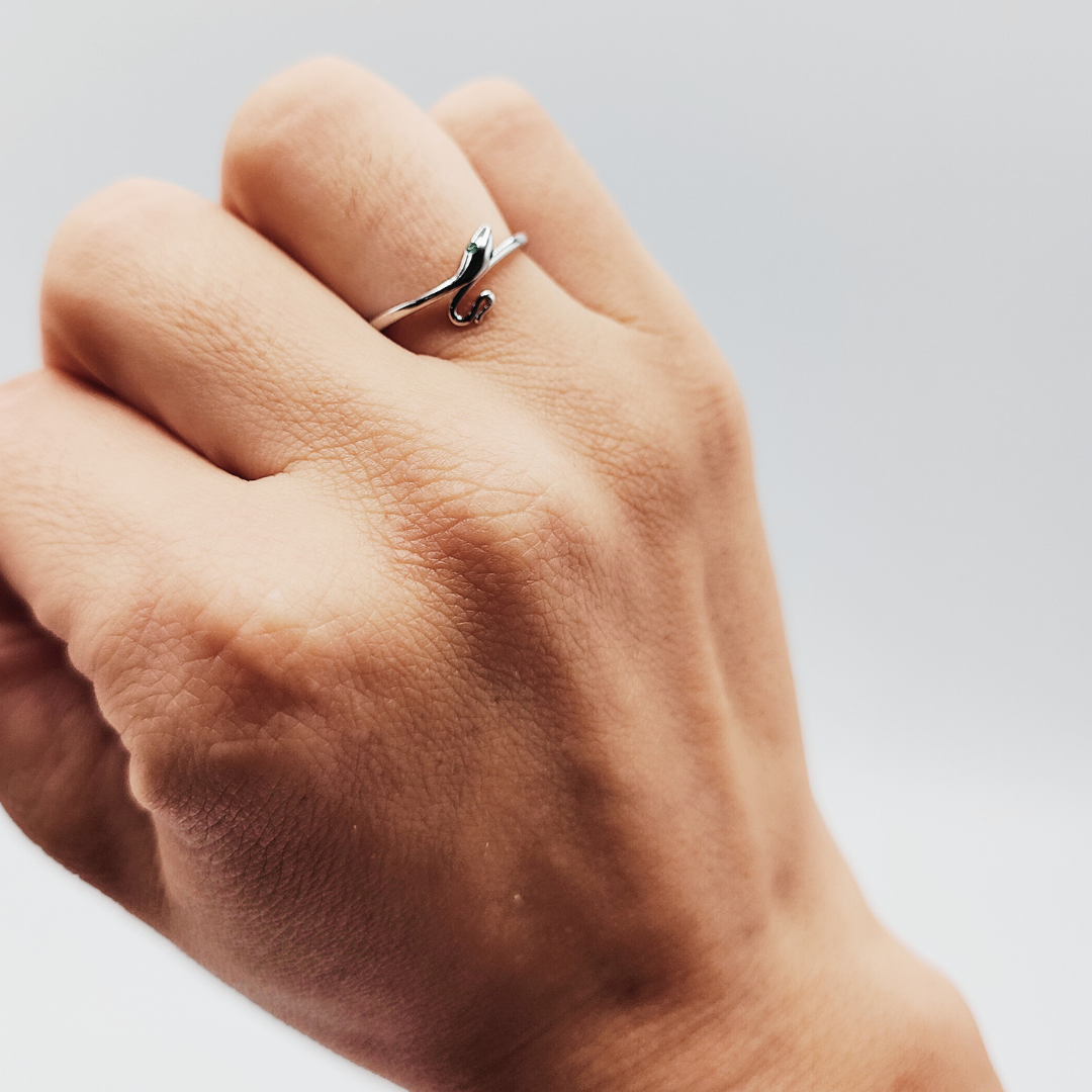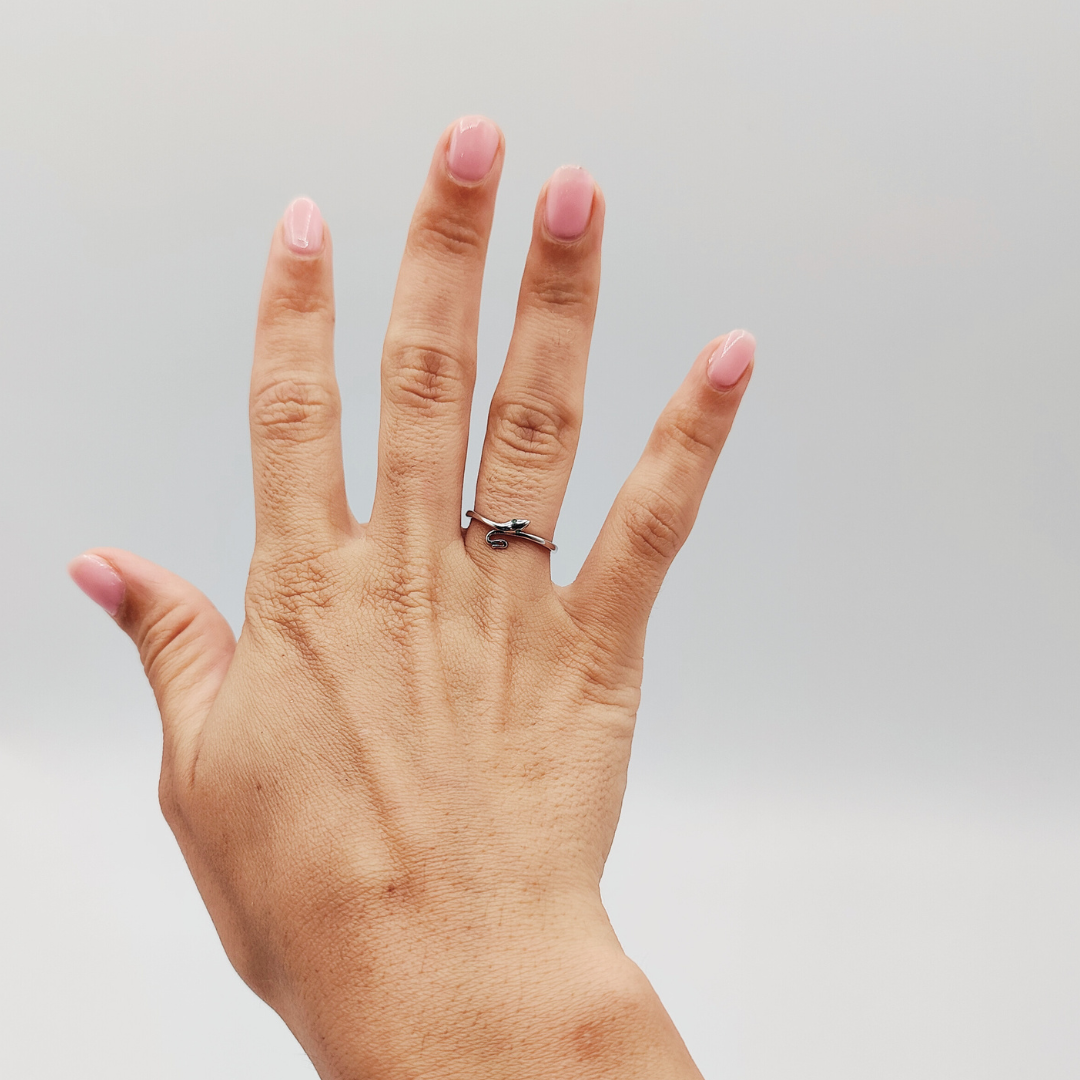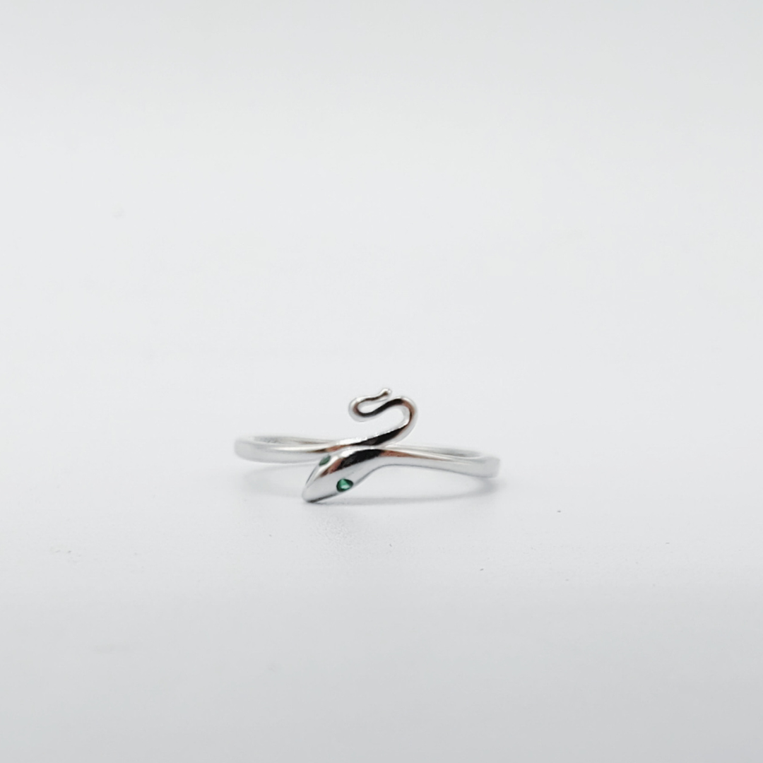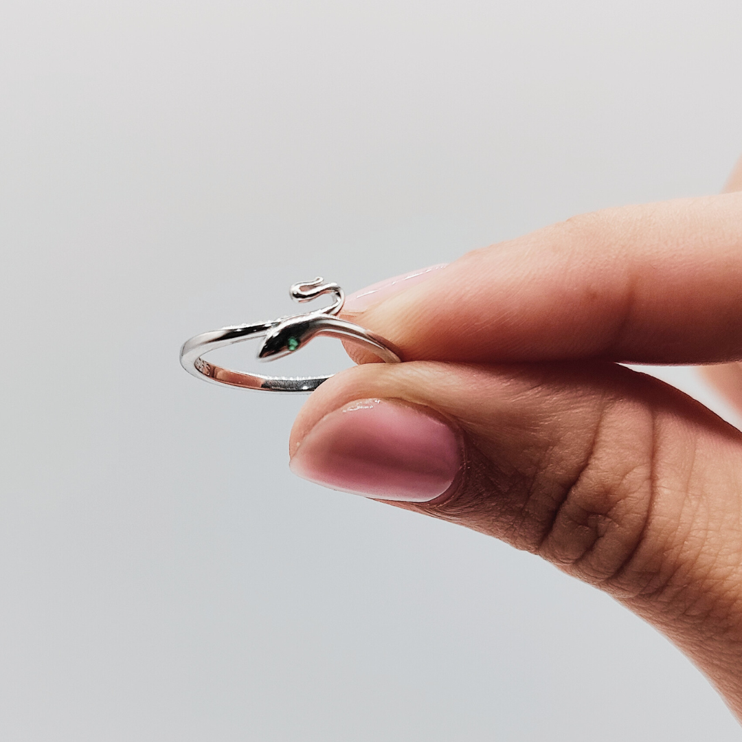 Este anillo se destaca por su diseño en forma de serpiente, que se enrosca elegantemente alrededor del dedo. Los ojos verdes, resplandecientes y enigmáticos, añaden un toque de misterio y sofisticación