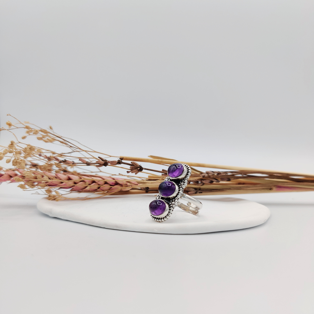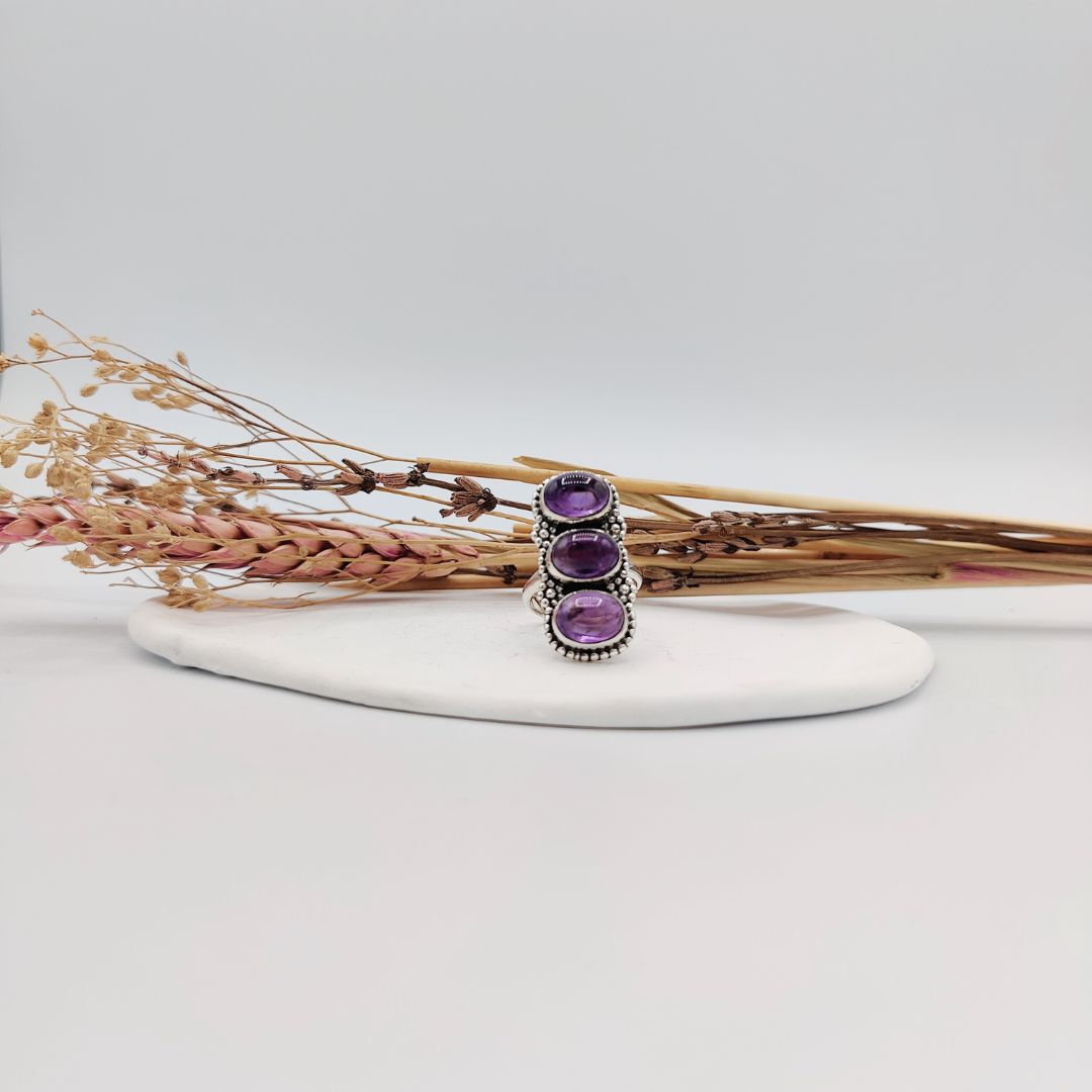 Imagina un deslumbrante anillo largo con tres amatistas, una encima de la otra, formando una elegante columna de tonos púrpuras. Este diseño único y llamativo captura la belleza y la profundidad de las piedras preciosas en una composición elegante y sofisticada.