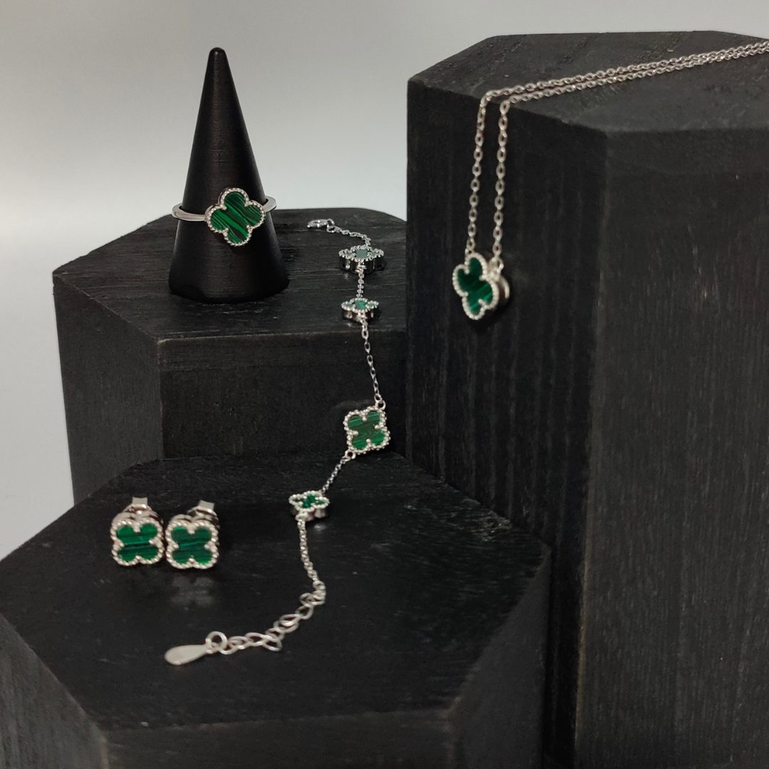 Pendientes de Plata con Flor Van Cleef y Piedra Malaquita – Sofisticación y Estilo
