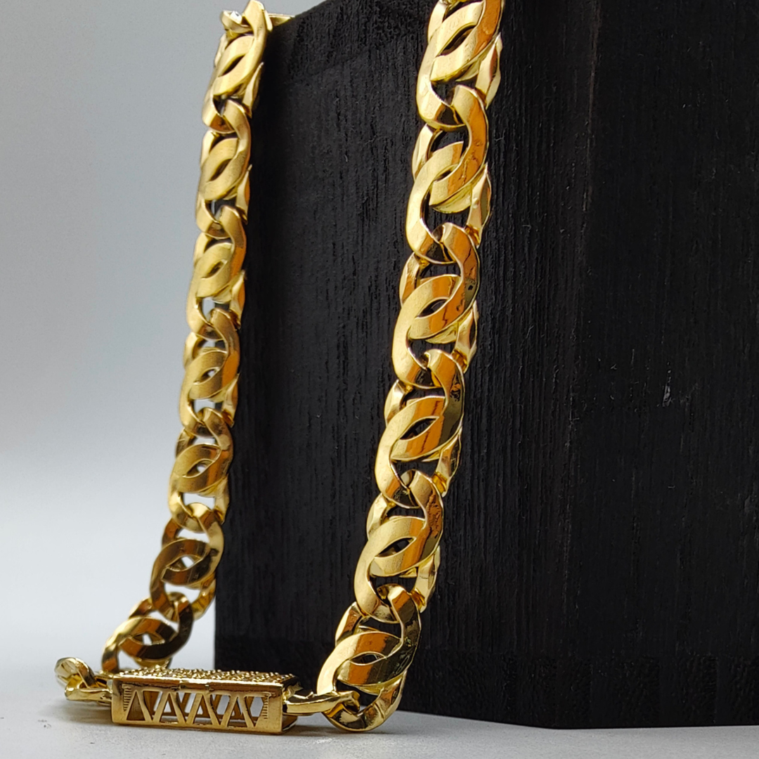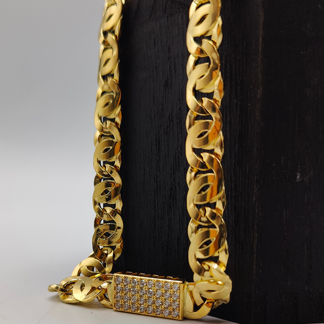 Esta impresionante cadena barbada, con una longitud de 62 cm y un grosor de 7 mm, es una pieza destacada de joyería que combina la robustez del diseño con la elegancia de las circonitas.