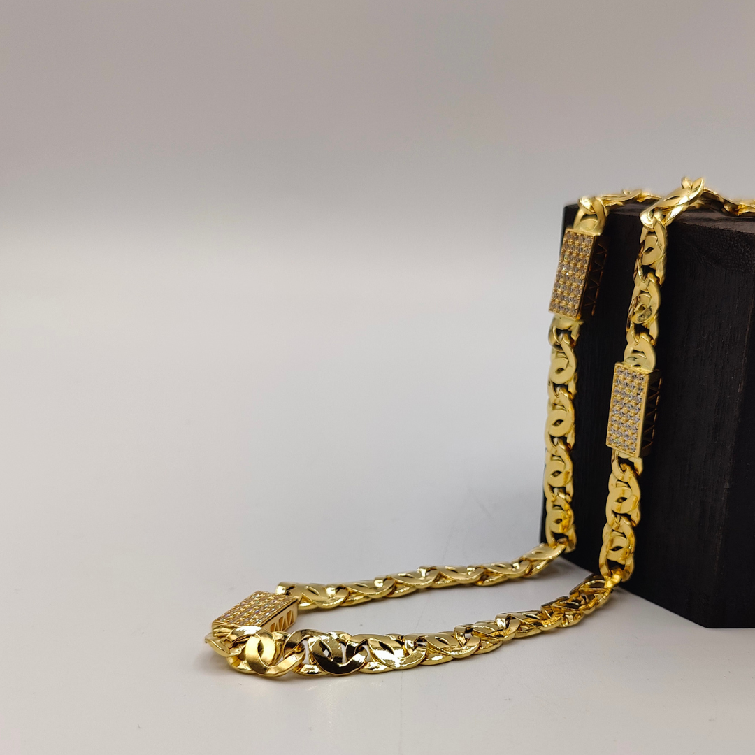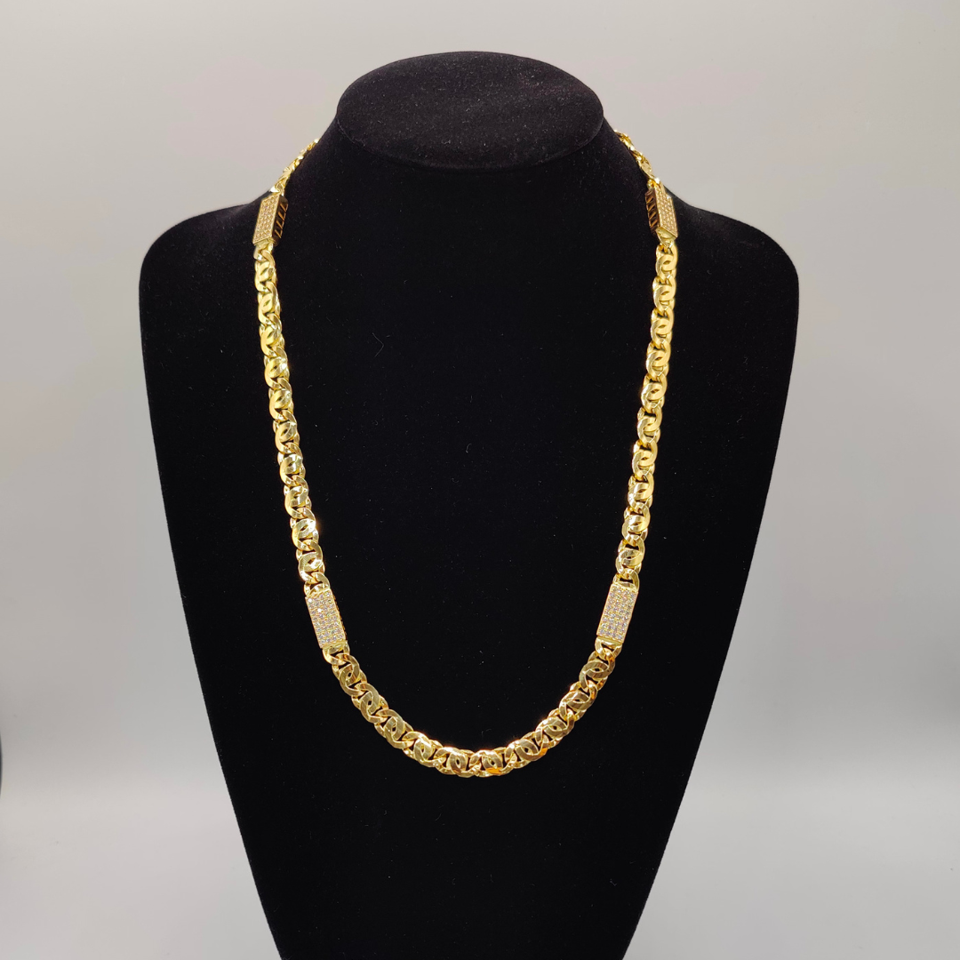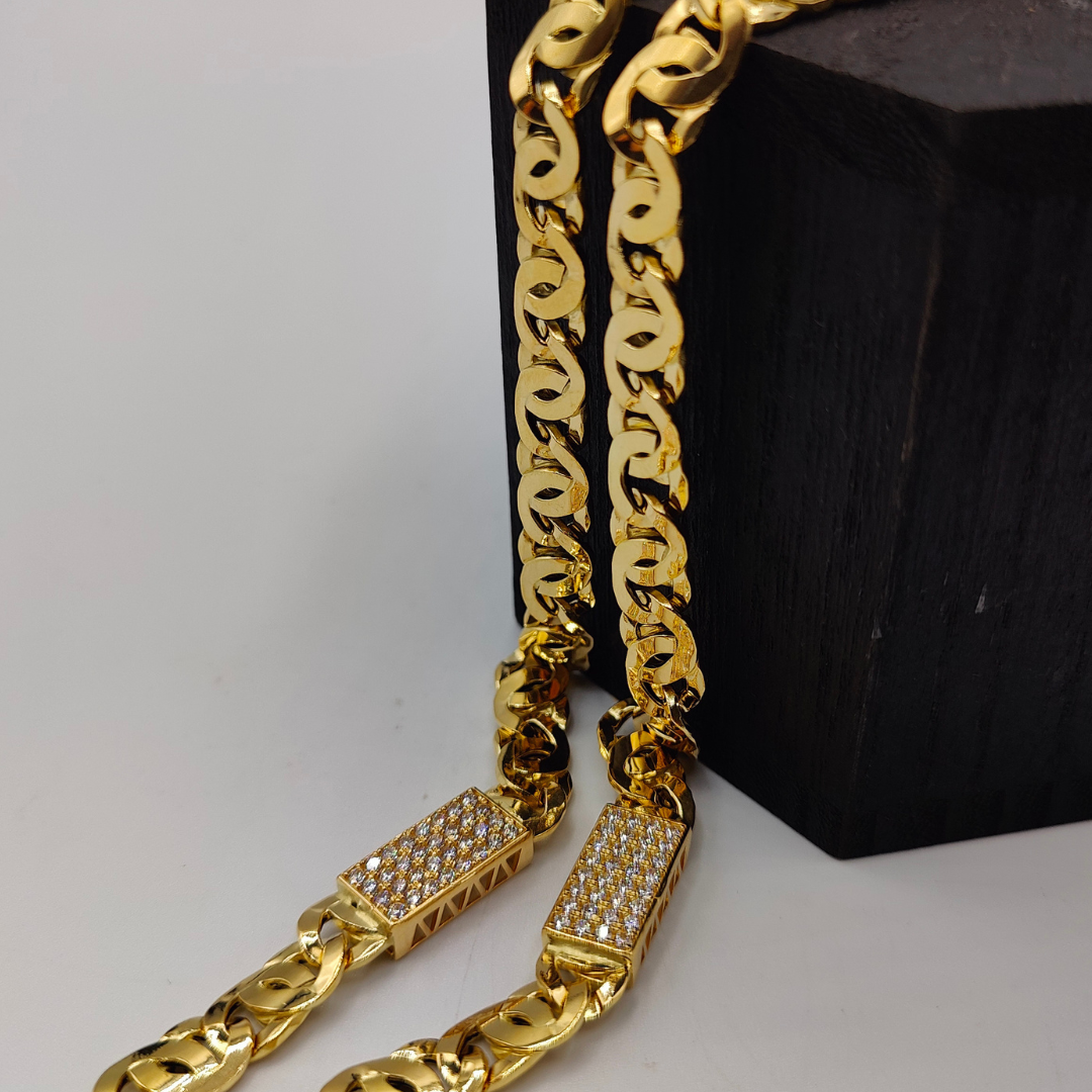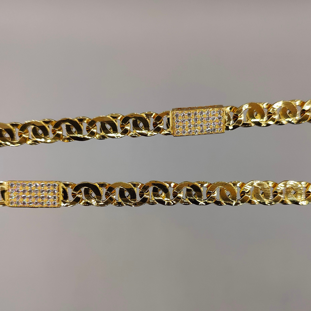 Los eslabones de la cadena tienen un diseño clásico, pero su atractivo radica en la inclusión de circonitas engastadas en cada uno de ellos. Estas circonitas, que pueden ser de color blanco o en una variedad de tonos vibrantes, añaden un toque de luz y destello, transformando esta cadena en un accesorio llamativo y glamuroso.