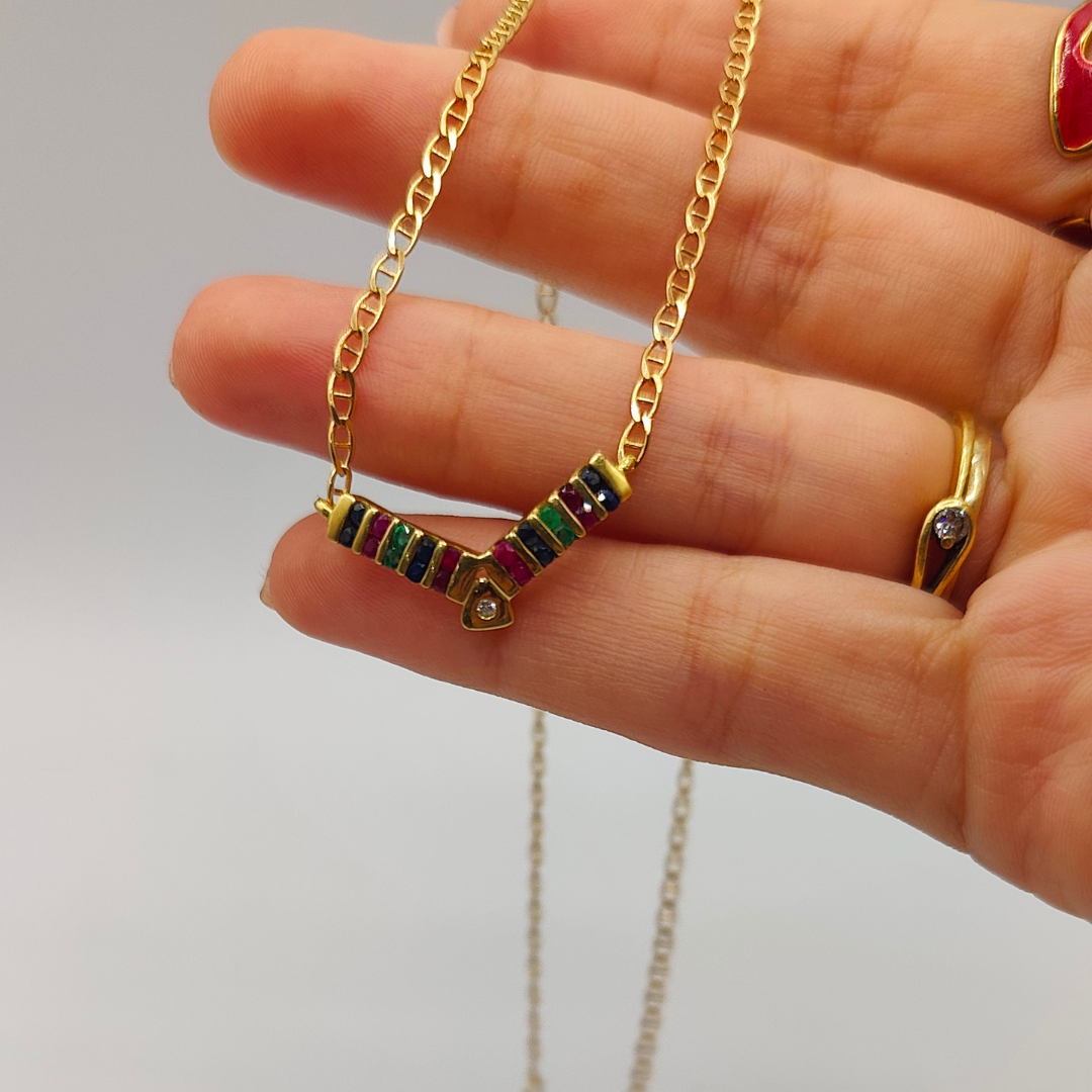 Explora la magnificencia de nuestro collar con cadena barbada, que presenta un deslumbrante colgante adornado con una exquisita combinación de zafiros, rubíes y esmeraldas, intercalados con un brillante diamante en el centro. Cada piedra preciosa ha sido cuidadosamente seleccionada y montada para crear una pieza que irradia lujo y sofisticación. Este collar es perfecto para quienes buscan una joya que combine color, brillo y elegancia en un diseño único. Ideal para ocasiones especiales o como una adición destacada a tu colección personal, este collar promete ser un tesoro que captarás miradas y admiración.