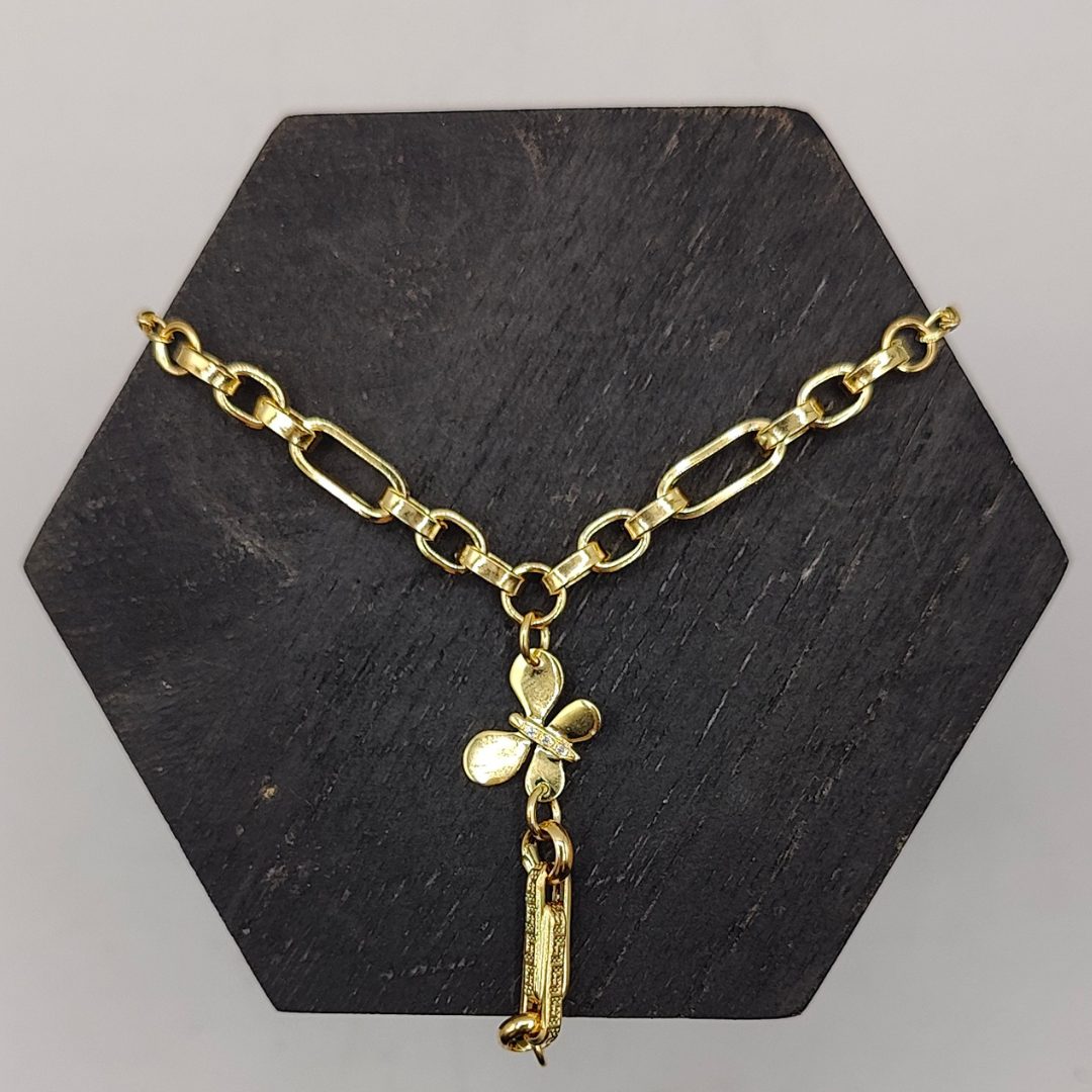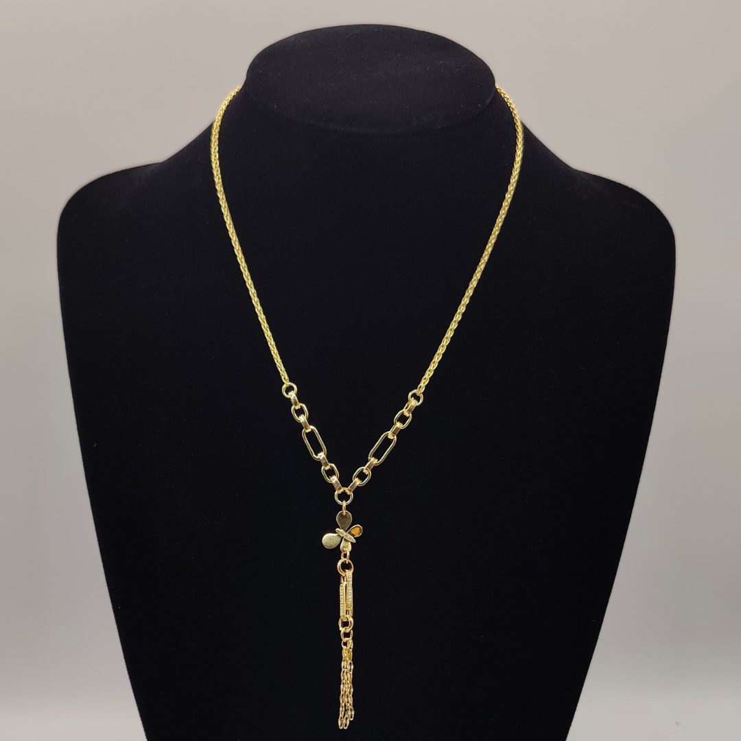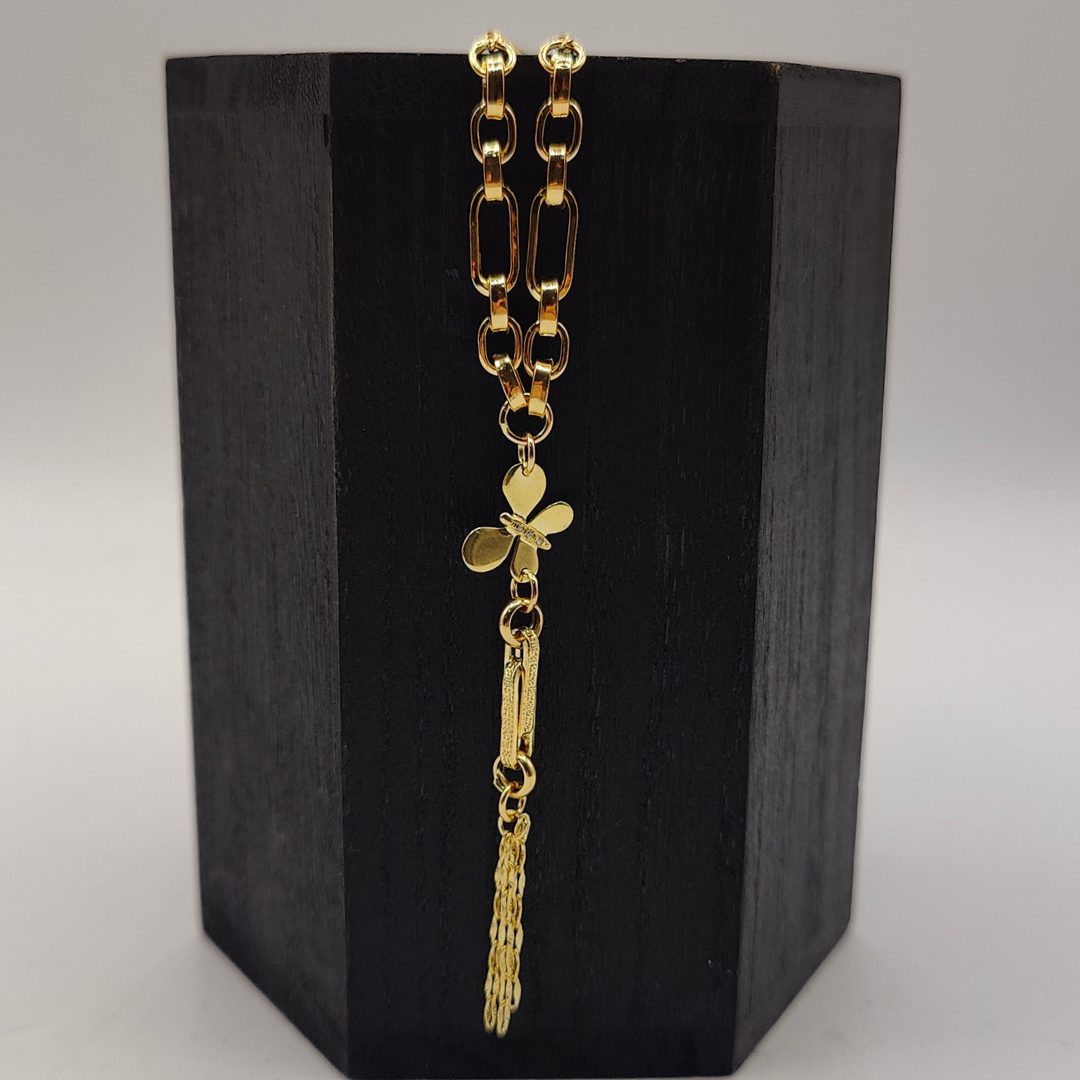 Eleva tu estilo con este exclusivo collar de oro 18K , diseñado con una sofisticada cadena de fantasía y un delicado dije de mini mariposa.
