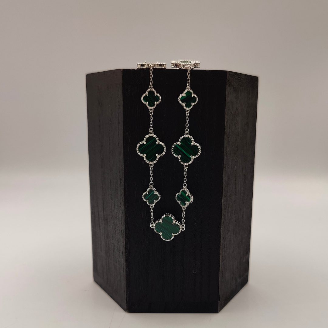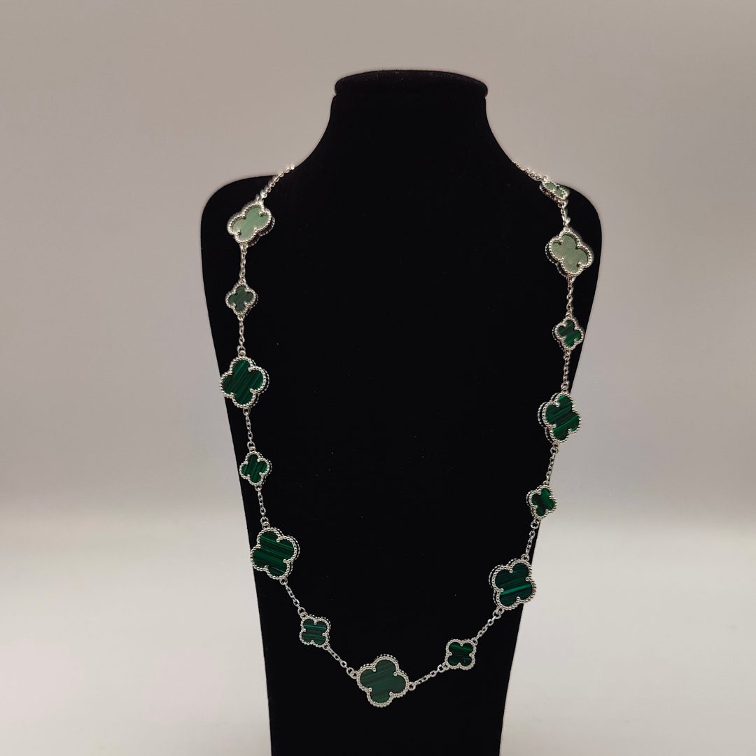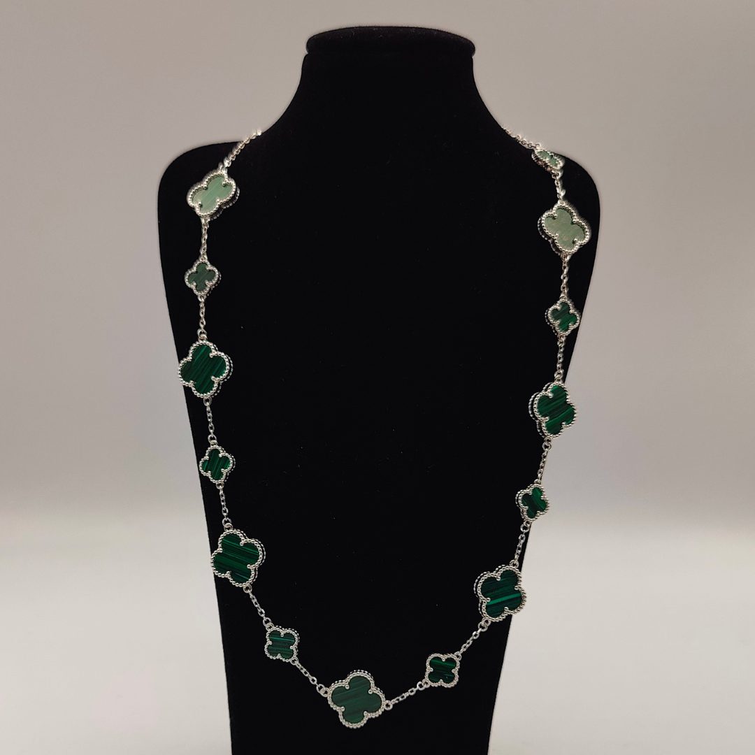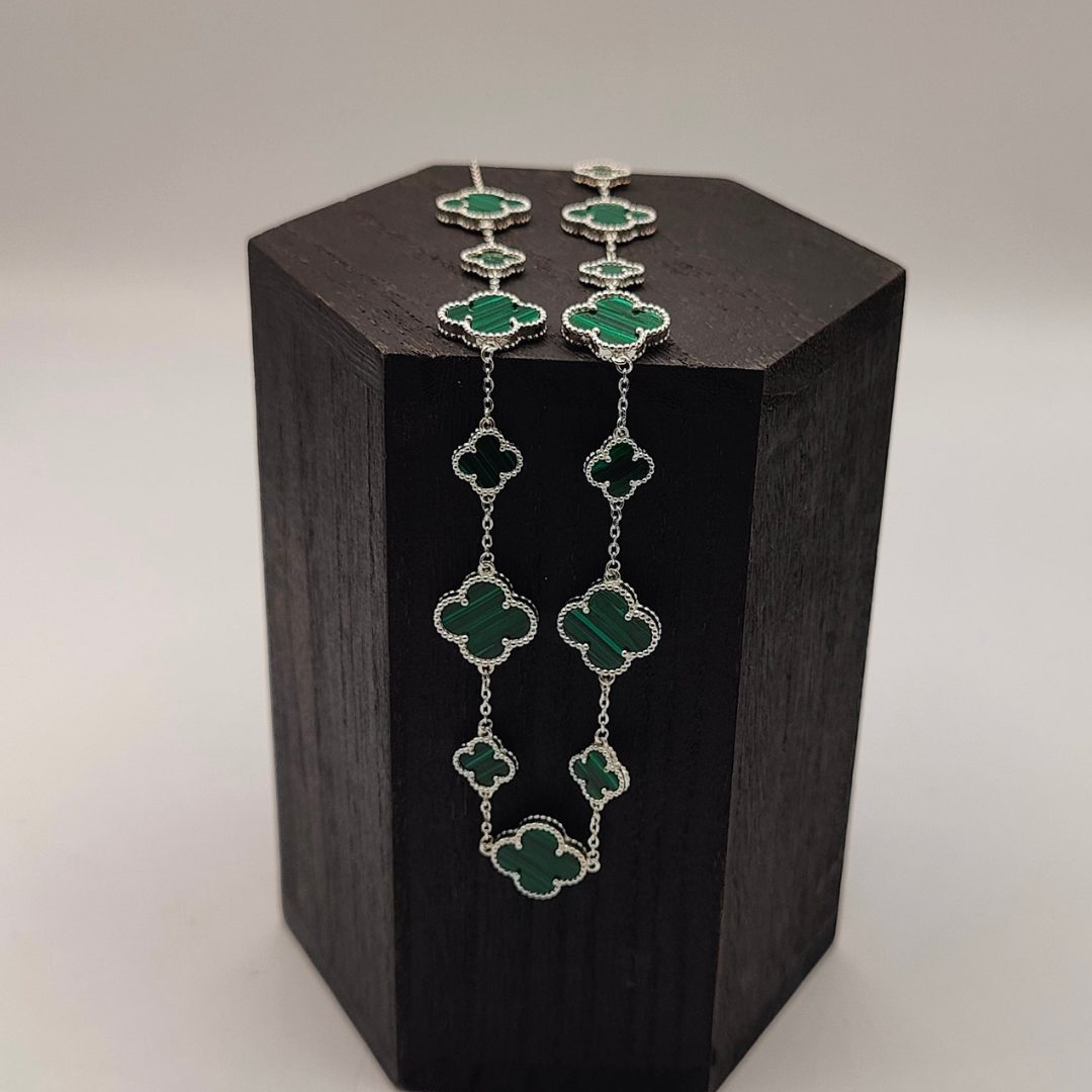 Descubre la elegante cadena Rolo de plata con flores Van Cleef de malaquita , una pieza sofisticada y atemporal. Su diseño exclusivo combina la durabilidad de la plata con la belleza natural de la malaquita.