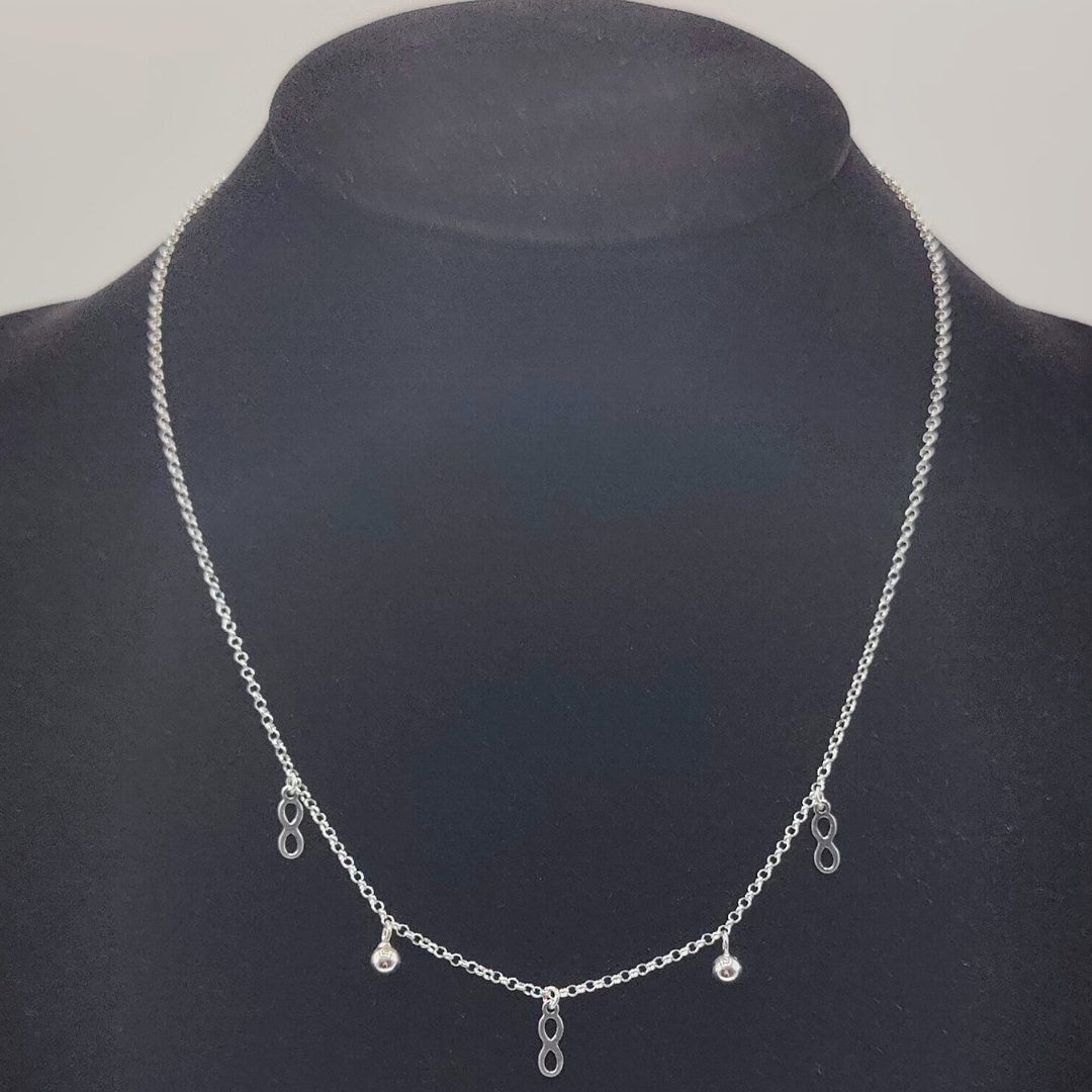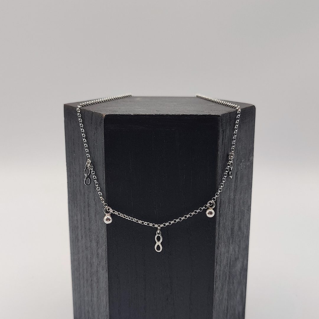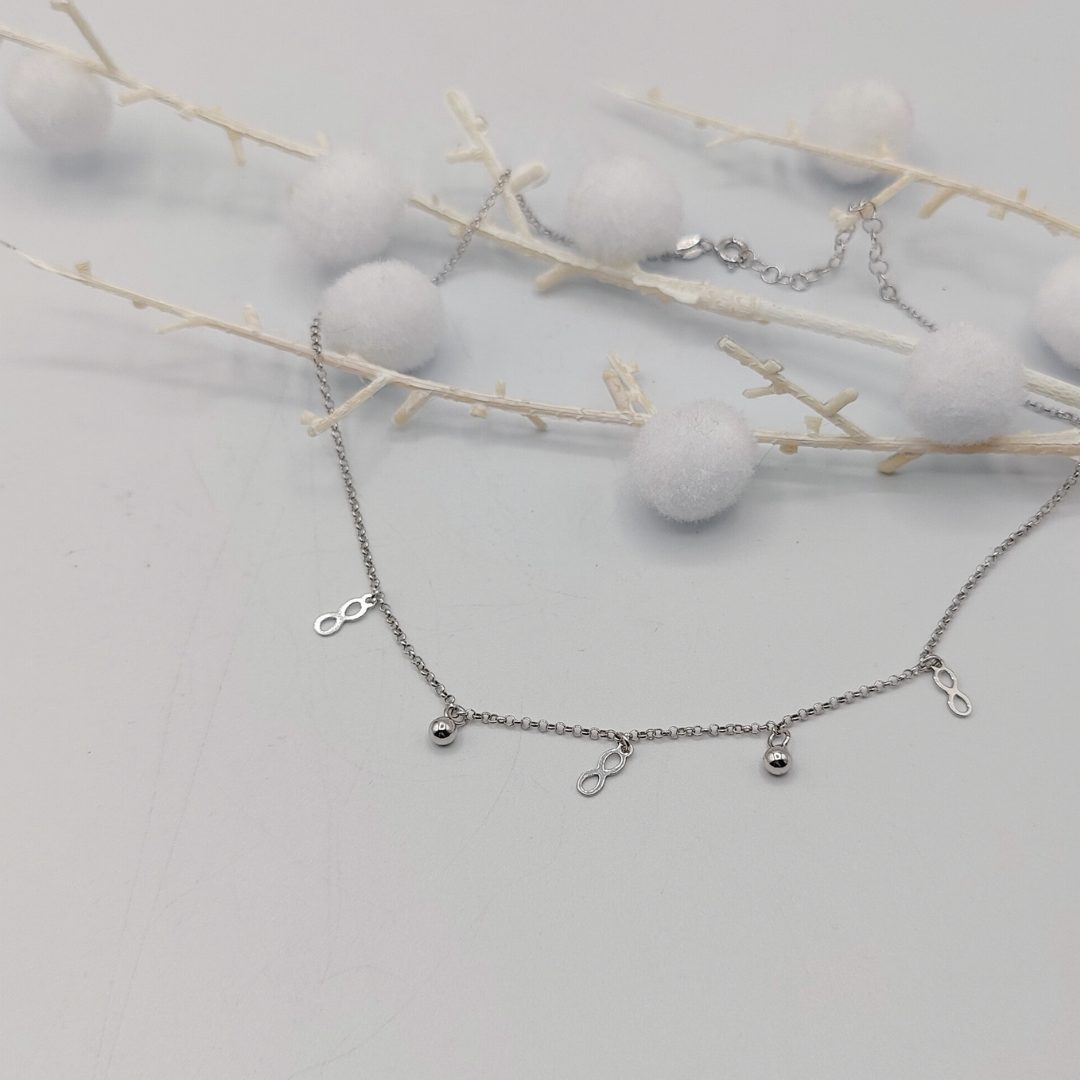 Este collar de plata 925 cuenta con una elegante cadena rolo, adornada con delicados charms de bolitas y símbolos de infinito.