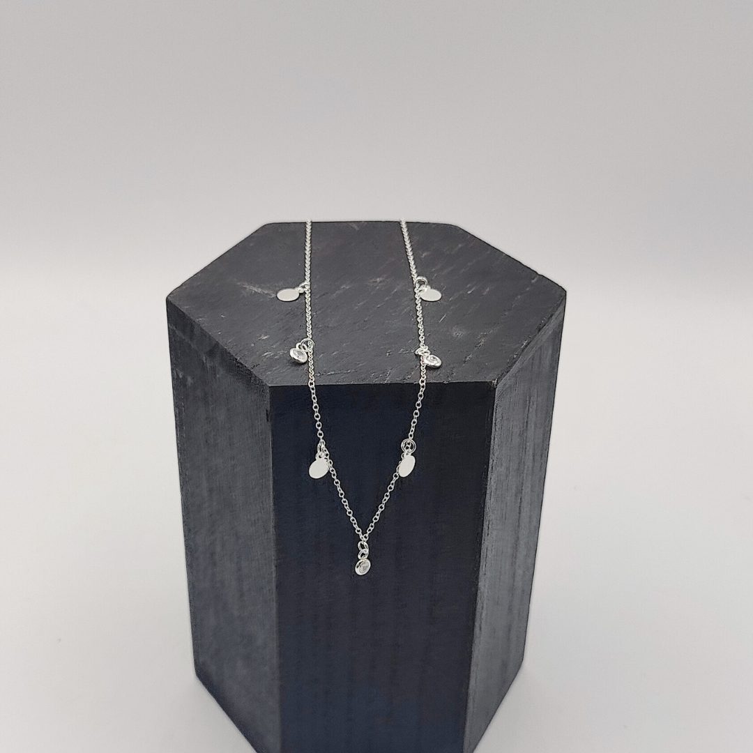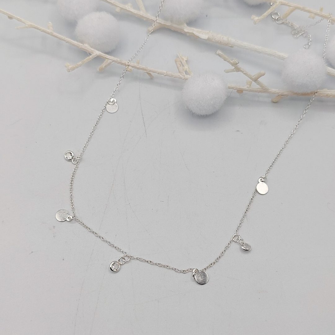 Este elegante collar de plata 925 presenta una cadena rolo adornada con encantadores charms de circonita blanca y formas redondas.