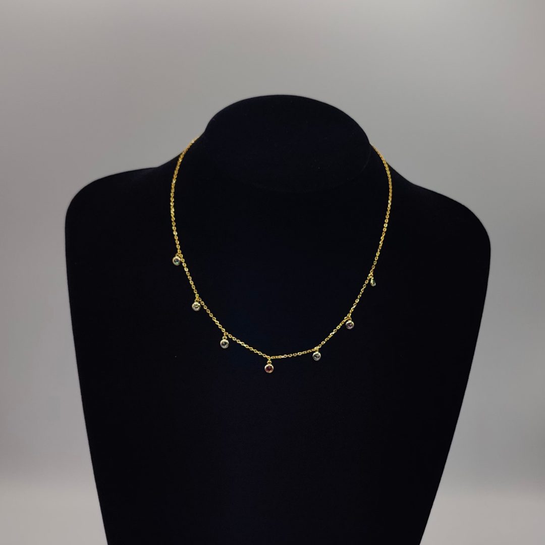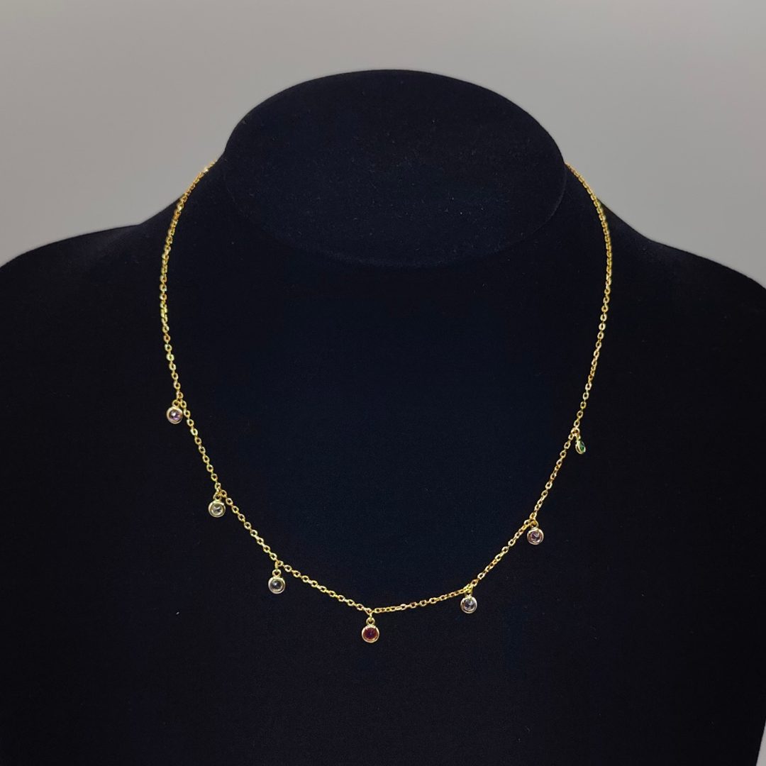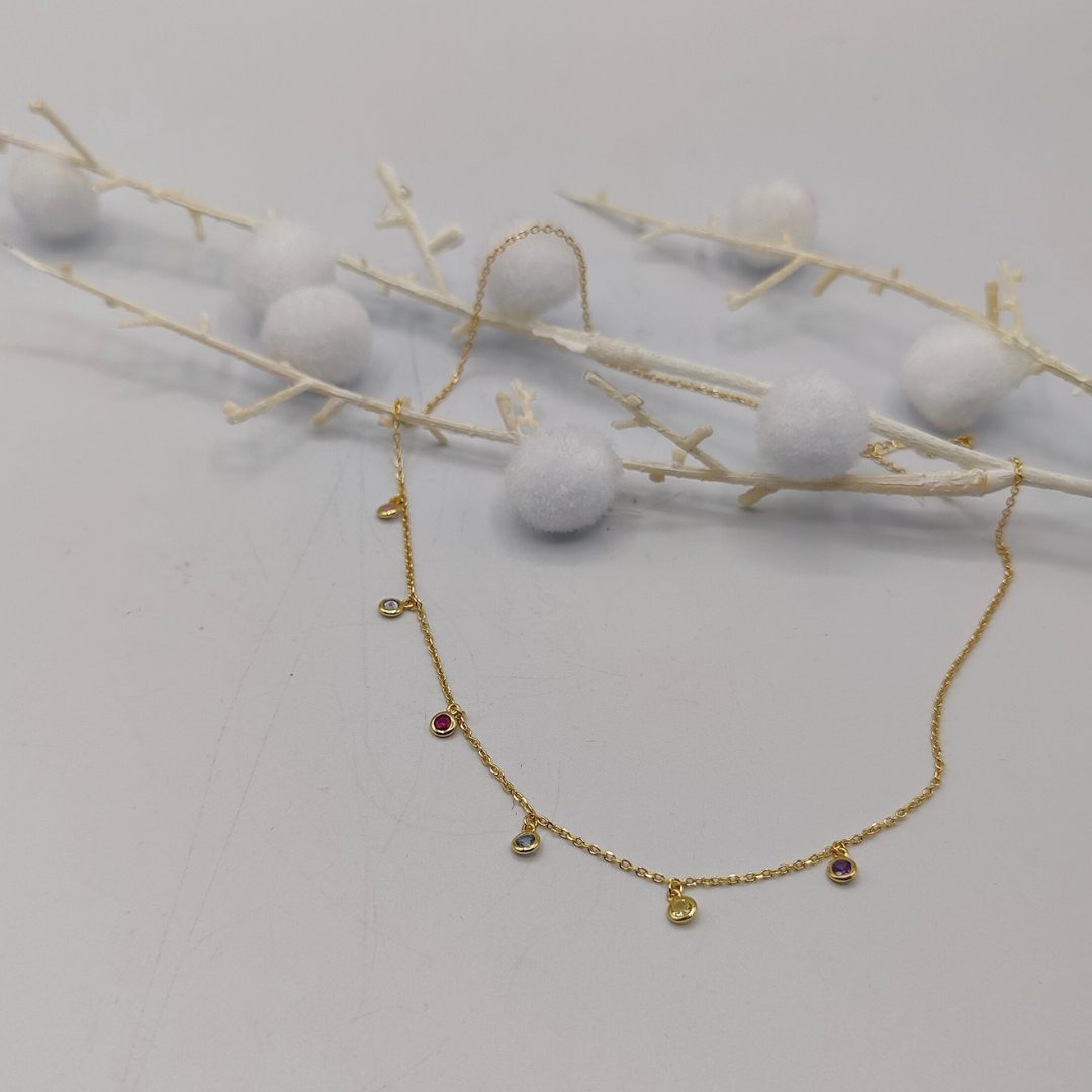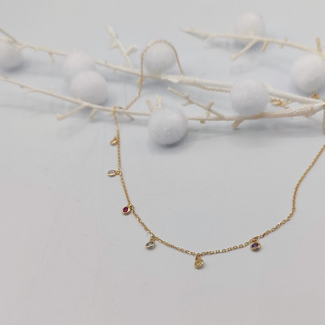 Este luminoso collar de plata 925 bañada en oro combina una elegante cadena rolo con pequeños charms de circonitas de colores. Una pieza alegre y sofisticada, perfecta para aportar un toque de brillo y color a cualquier conjunto, tanto en el día a día como en ocasiones especiales.