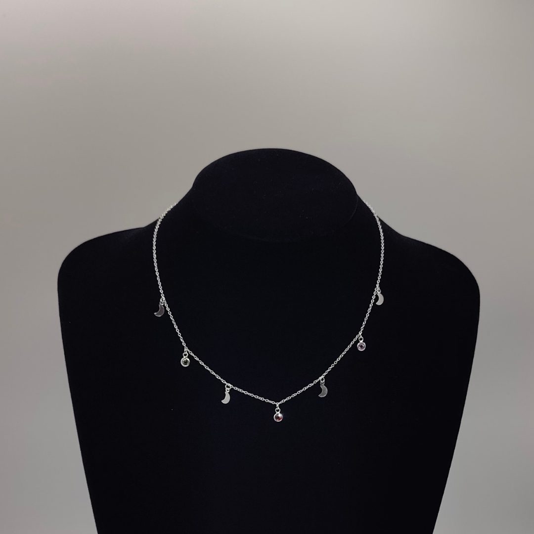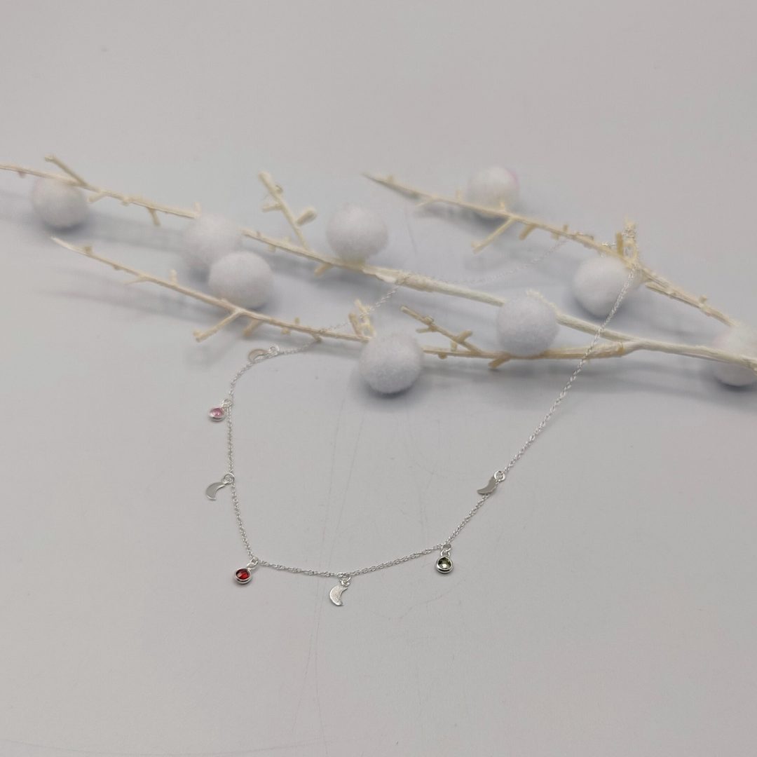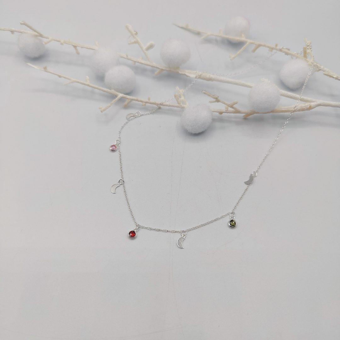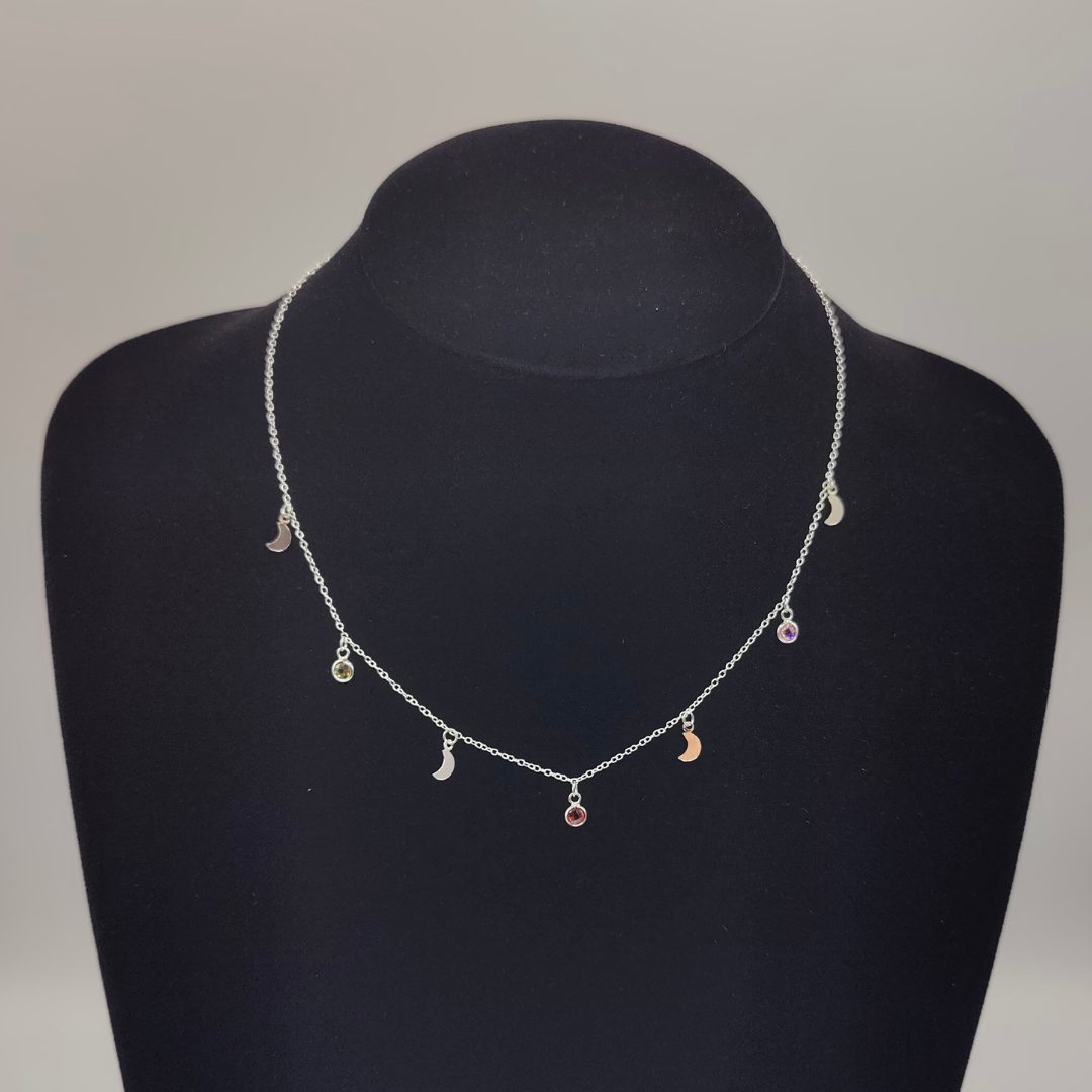 Llena de magia tu estilo con este collar de plata 925 y cadena rolo, decorado con delicados charms de lunas y circonitas de colores