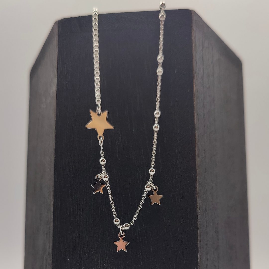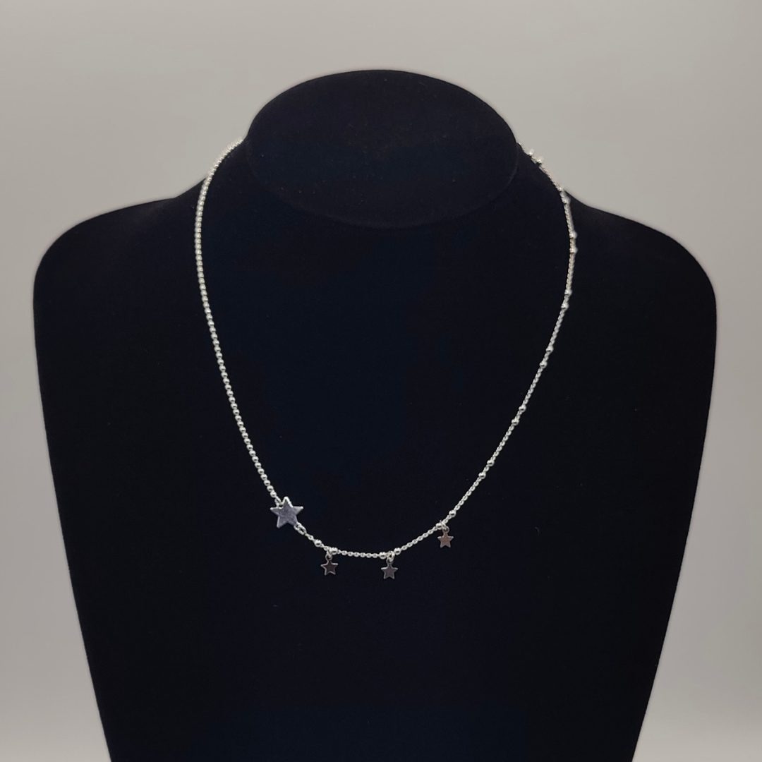 Un diseño encantador que combina sencillez y brillo. Este collar de bolitas en plata incorpora delicados charms de estrellas que aportan un toque mágico y juvenil. Perfecto para usar solo o en combinación con otros collares, es una pieza versátil que ilumina cualquier estilo con un sutil destello celestial.