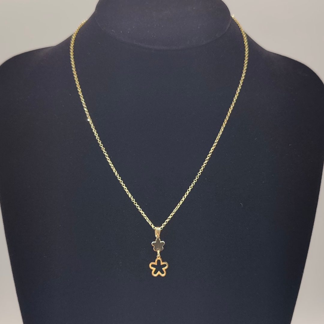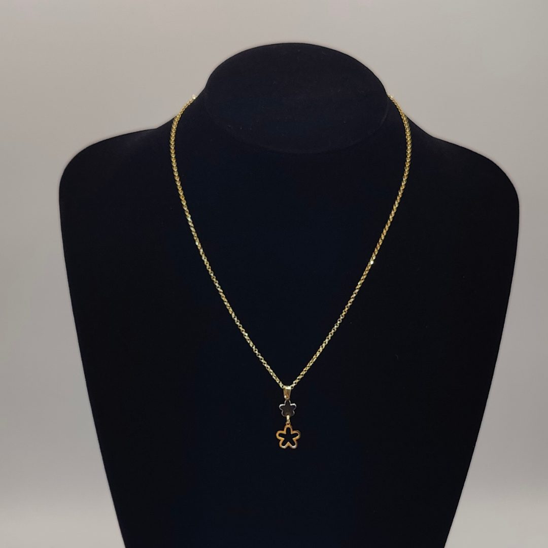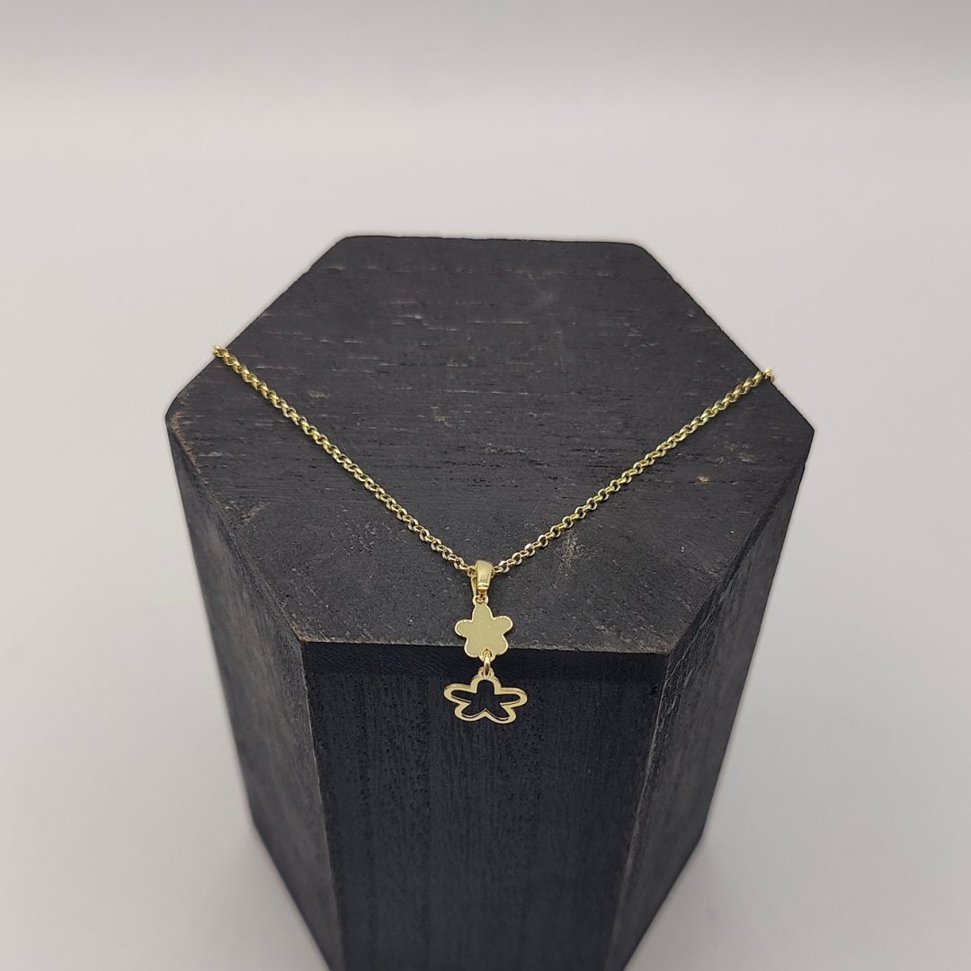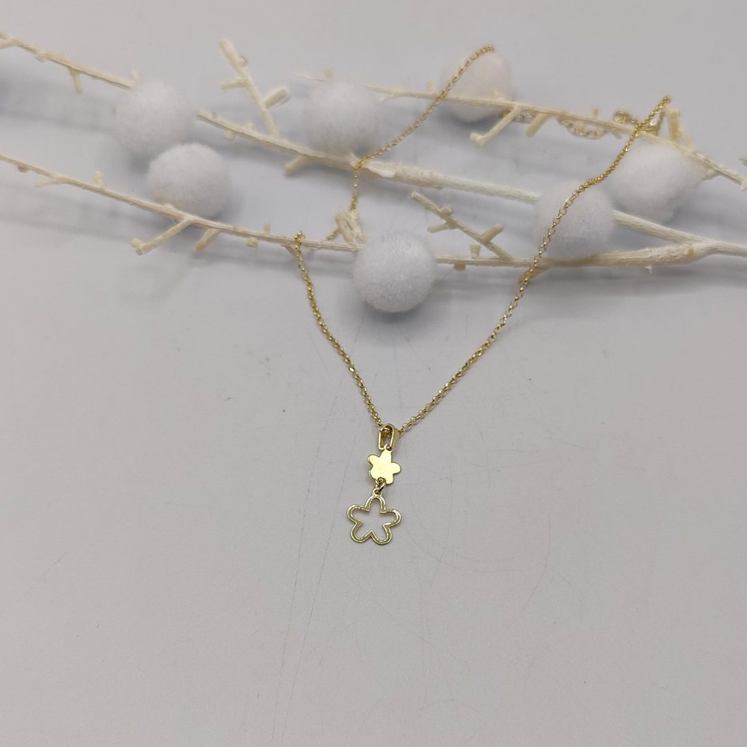 Delicado y elegante, este collar presenta una cadena tipo rolo en plata, adornada con dos colgantes de flores que evocan la frescura y feminidad de la naturaleza. Uno de los colgantes destaca por su diseño calado en plata dorada, aportando un toque sofisticado y luminoso al conjunto. Ideal para lucir a diario o dar un acento refinado a tus looks especiales.