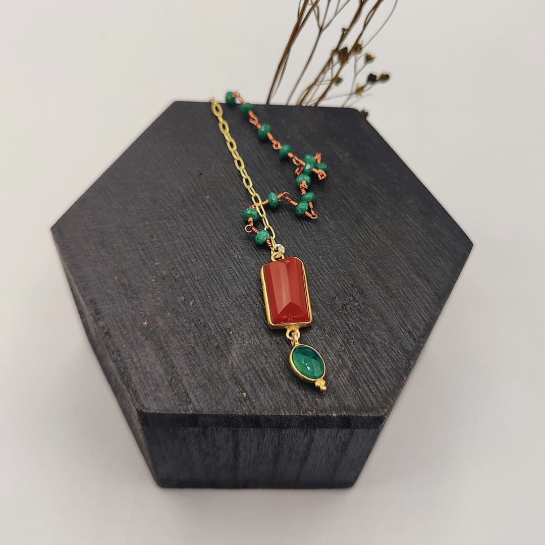 La cornalina, con su distintivo color naranja rojizo, crea un contraste vibrante con las esmeraldas. Sus tonalidades cálidas aportan energía y vitalidad al diseño. Las piedras están colocadas en un engaste de plata que resalta sus colores, mientras que los detalles de cobre añaden un toque artesanal que hace de este collar una pieza.