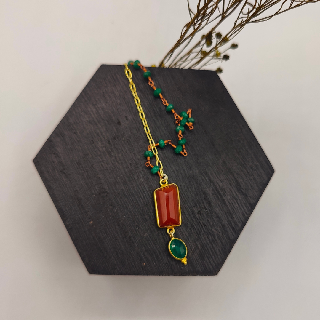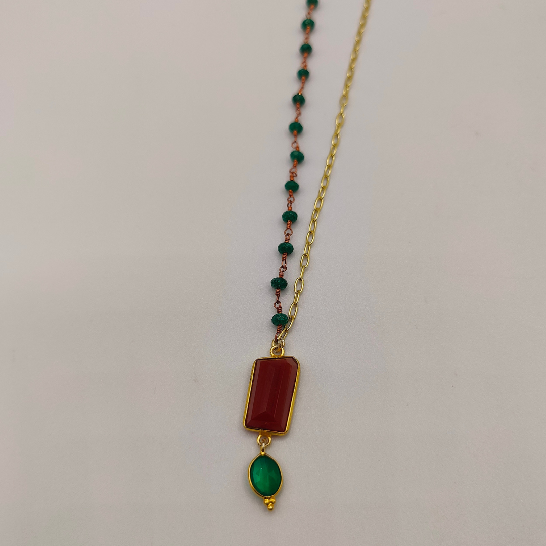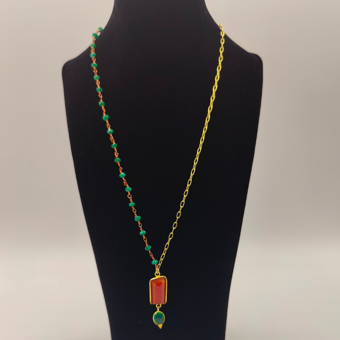 Este collar combina la elegancia de la plata y el cobre con la belleza natural de las esmeraldas y la cornalina. La base del collar está hecha de plata brillante.