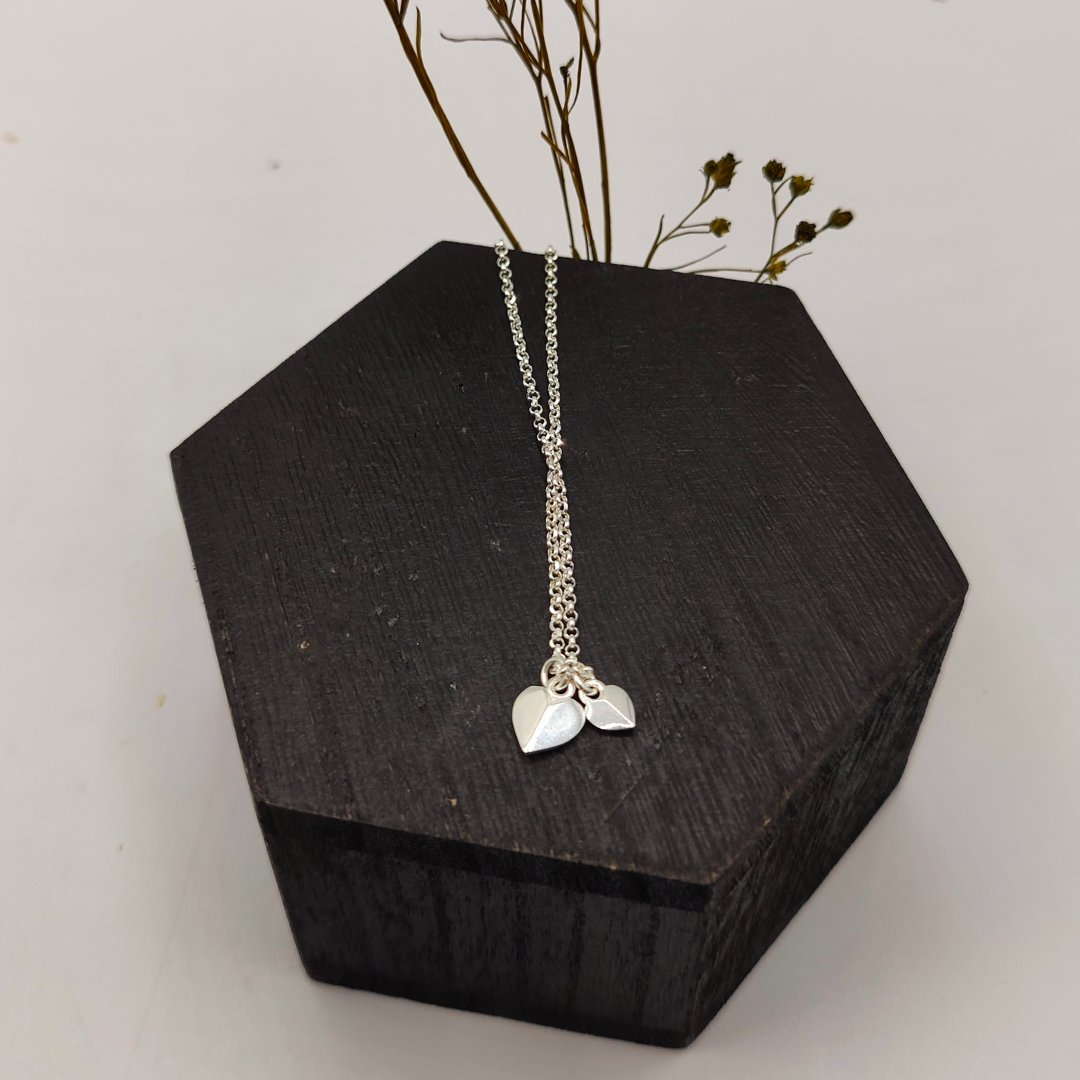 Con su longitud ajustable, este collar se adapta cómodamente al cuello, permitiendo que los corazones caigan de manera encantadora. Es un accesorio versátil que complementa cualquier atuendo, ya sea casual o más elegante. En resumen, este collar de plata con dos corazones colgantes es una pieza atemporal que celebra el amor y la belleza
