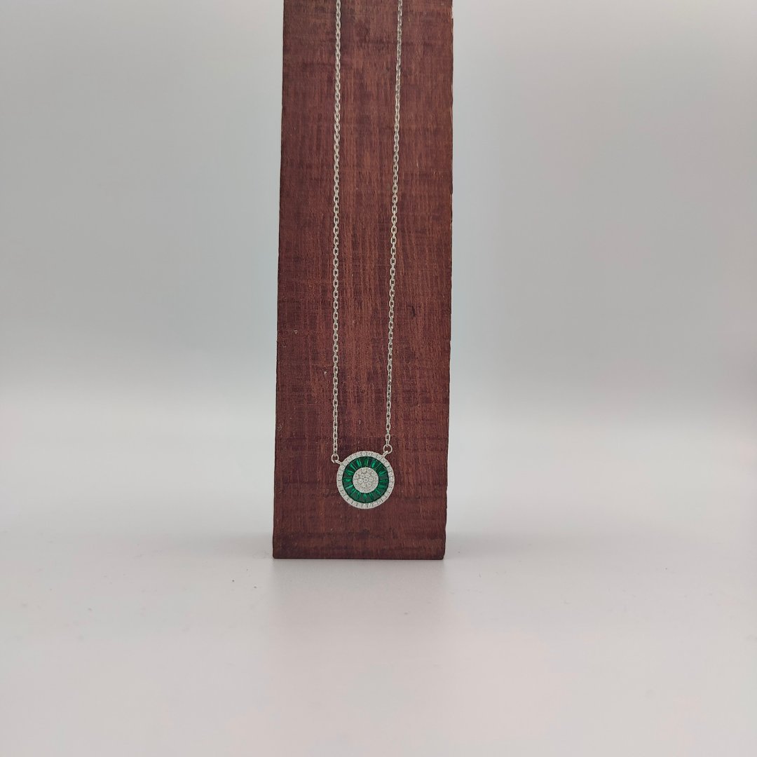 Sumérgete en la elegancia con nuestro collar adornado con un colgante redondo, resplandeciente con deslumbrantes circonitas verdes. Cada cristal brilla con intensidad, capturando la esencia de la naturaleza en su máxima expresión. Con un diseño refinado y un toque de encanto natural, este collar es la elección perfecta para añadir un toque de frescura y sofisticación a cualquier conjunto.