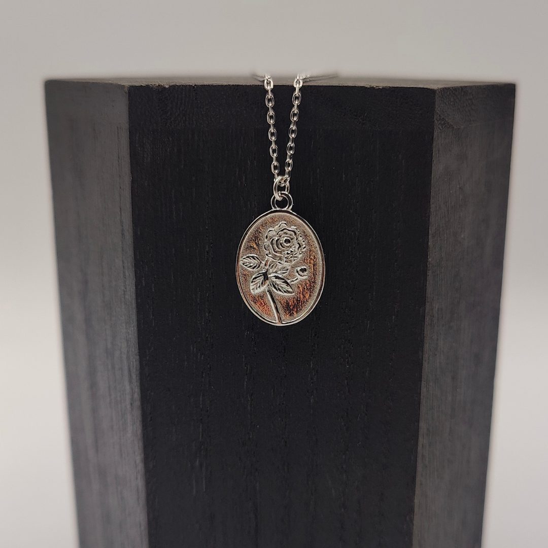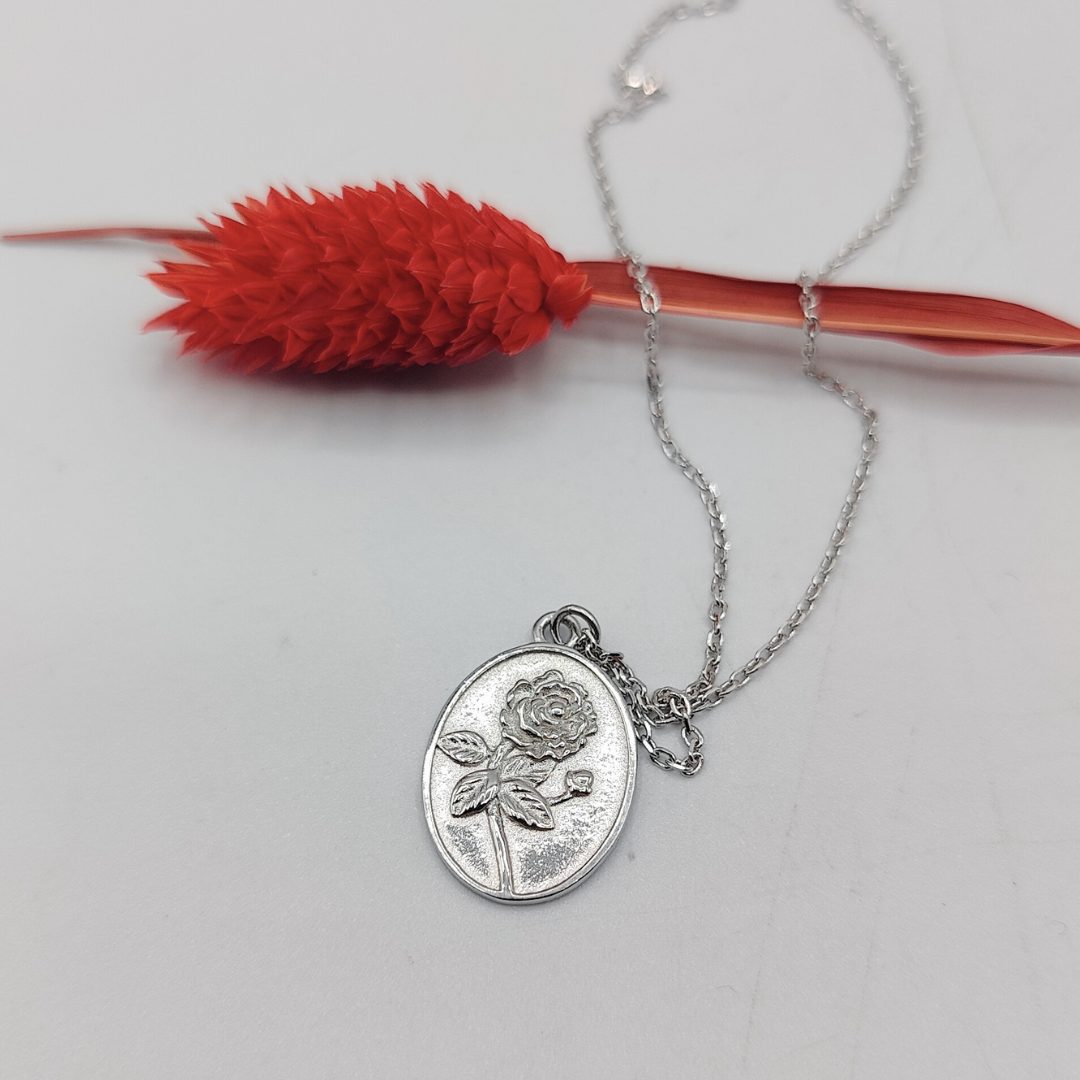 Un collar lleno de significado y estilo. Su colgante de plata puede personalizarse con un grabado en un lado, mientras que el reverso ya lleva una delicada rosa grabada, símbolo de amor.