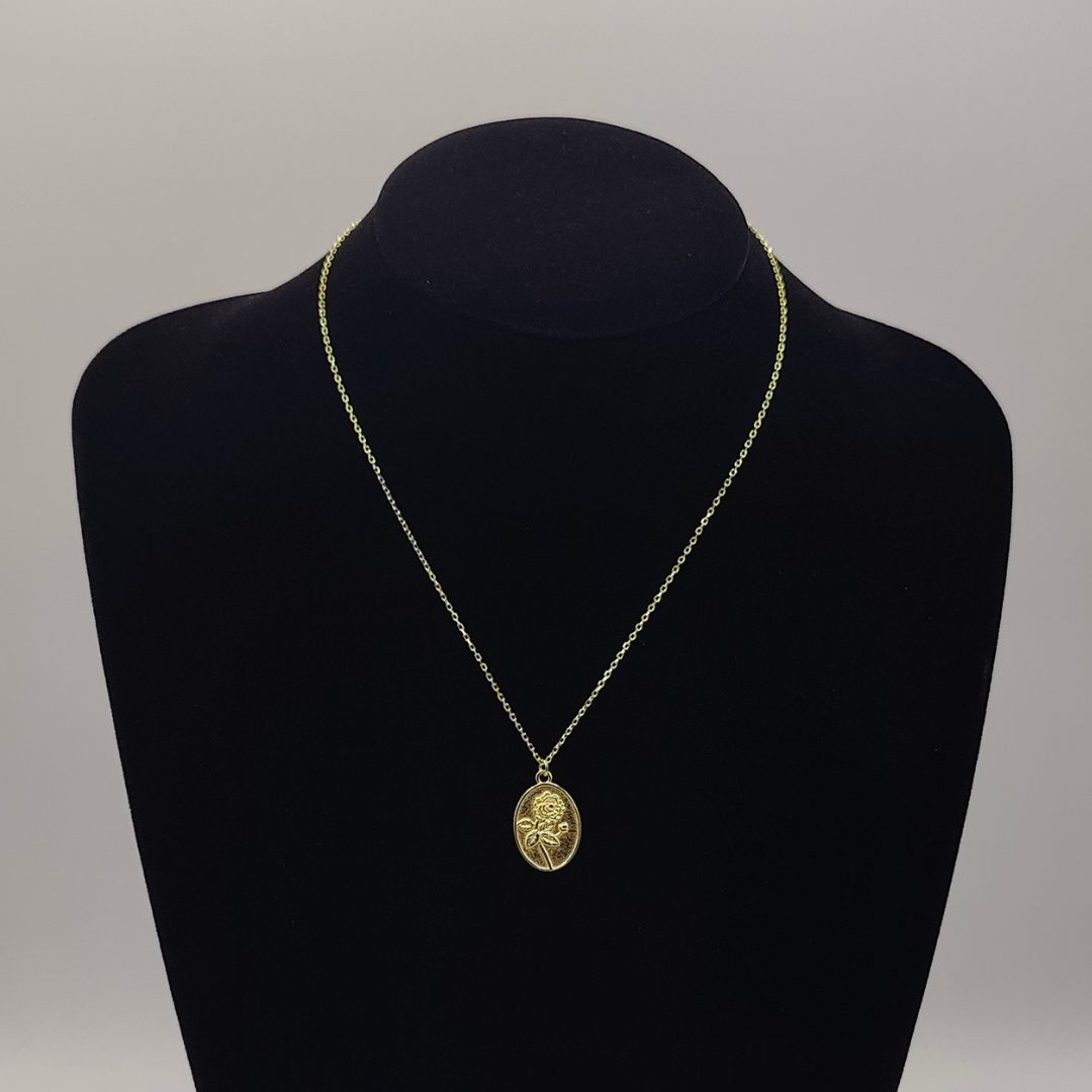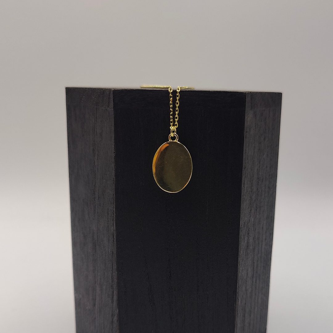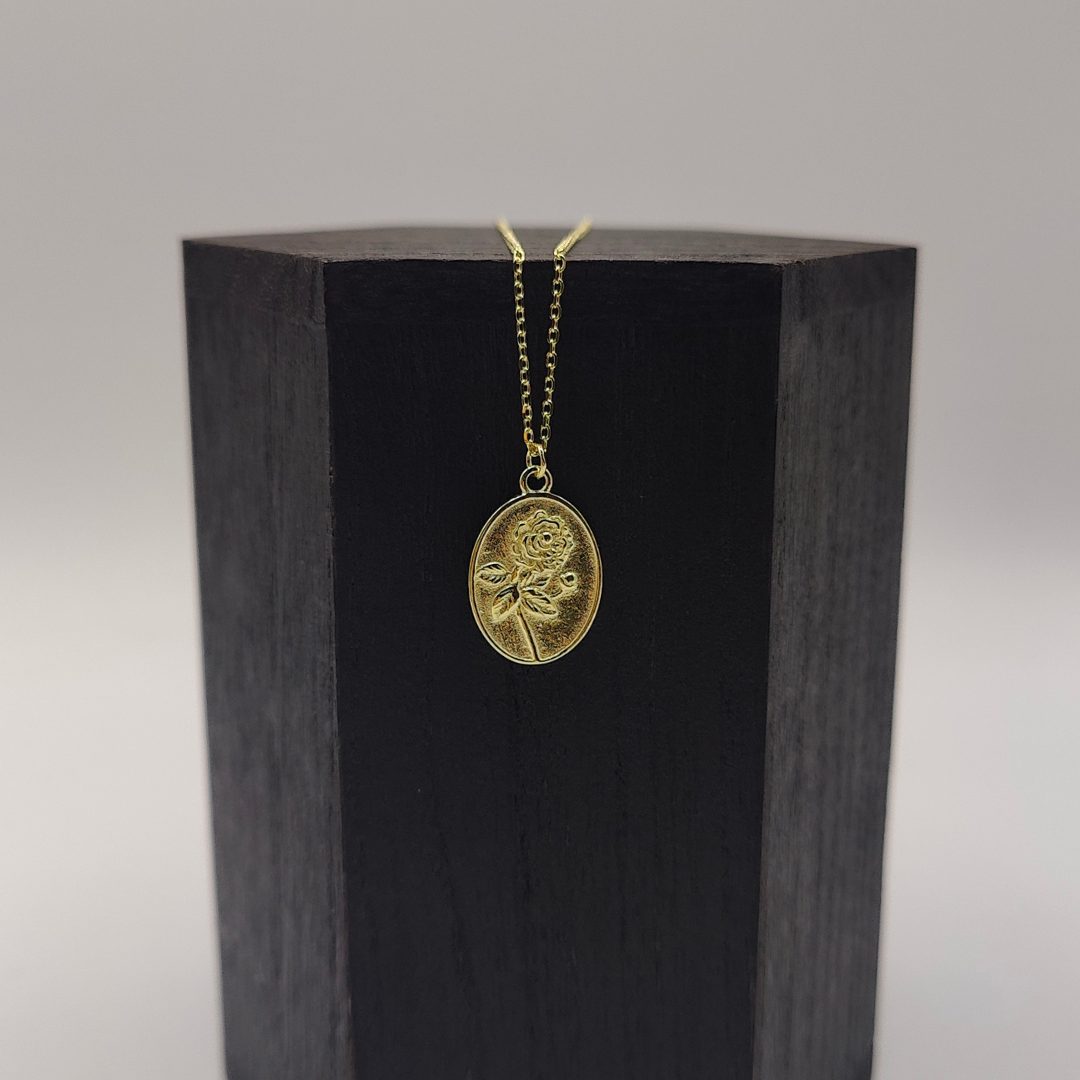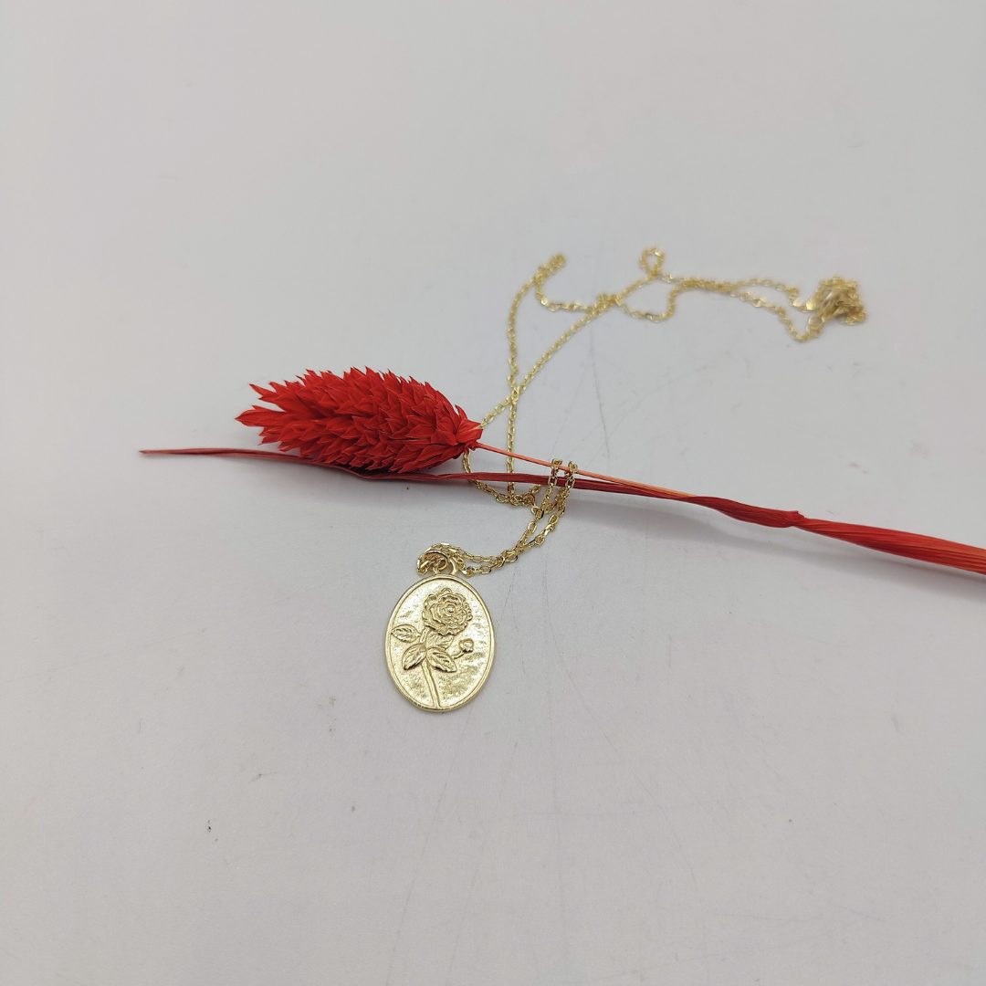 Este collar único presenta una elegante placa de plata que puede ser personalizada con un grabado, haciendo de esta pieza una joya verdaderamente personal. En el reverso, se encuentra una delicada rosa grabada, símbolo de belleza y elegancia eterna. La cadena rolo de plata dorada complementa a la perfección, añadiendo un toque cálido y sofisticado a esta pieza versátil, ideal para regalar o llevar como amuleto personal.