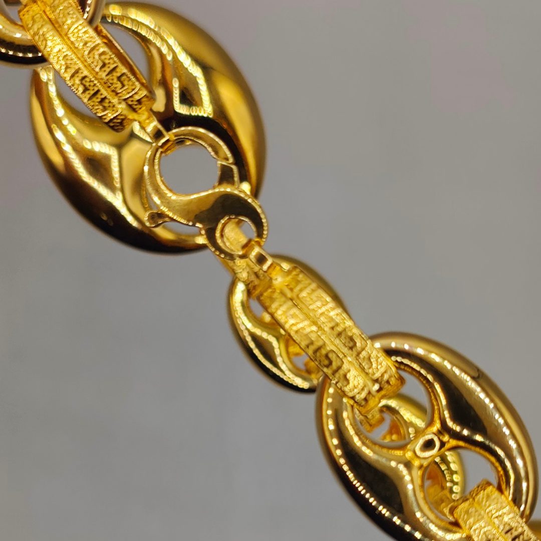 Este impresionante collar estilo Versace presenta una cadena calabrote única, donde los calabrotes más grandes miden 45 mm y los más pequeños 25 mm, creando un contraste visual llamativo y sofisticado. El diseño incluye una cara de medusa, un símbolo icónico de la marca, en el centro, aportando un toque de lujo y distinción.