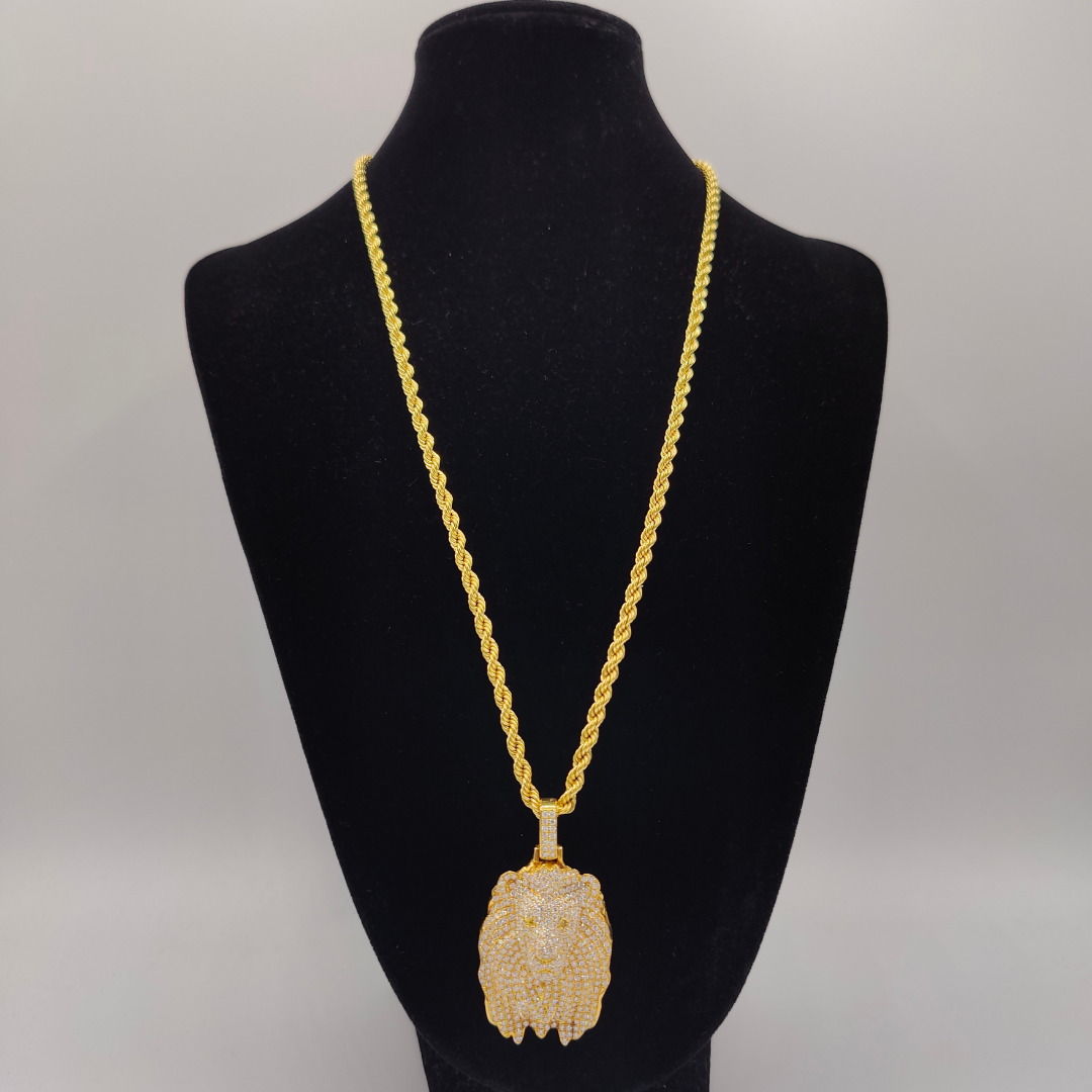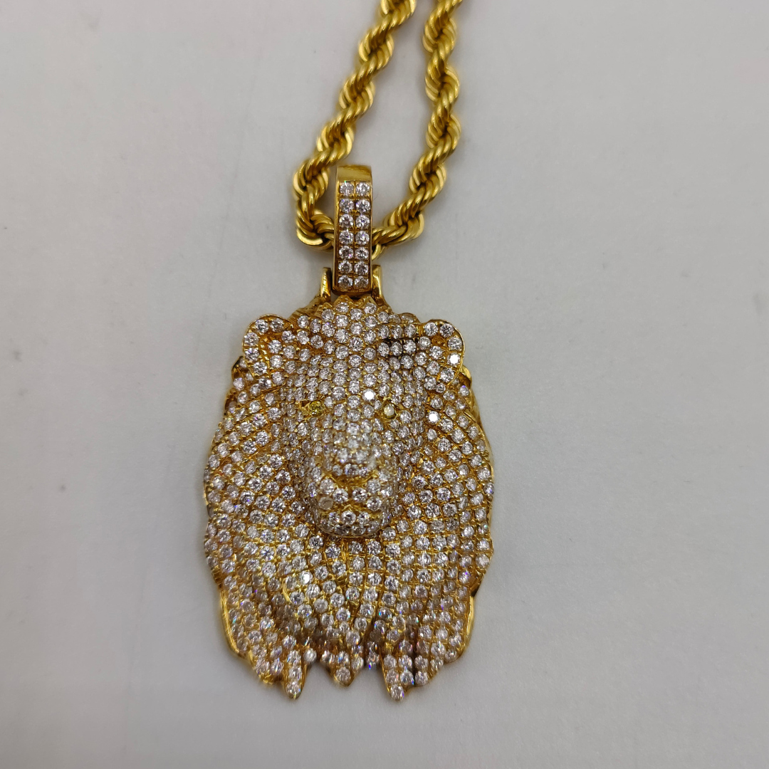 Descubre el imponente colgante de león, una joya majestuosa que combina elegancia y poder. Este colgante, meticulosamente hecho a mano en oro de 14 quilates, está completamente adornado con diamantes