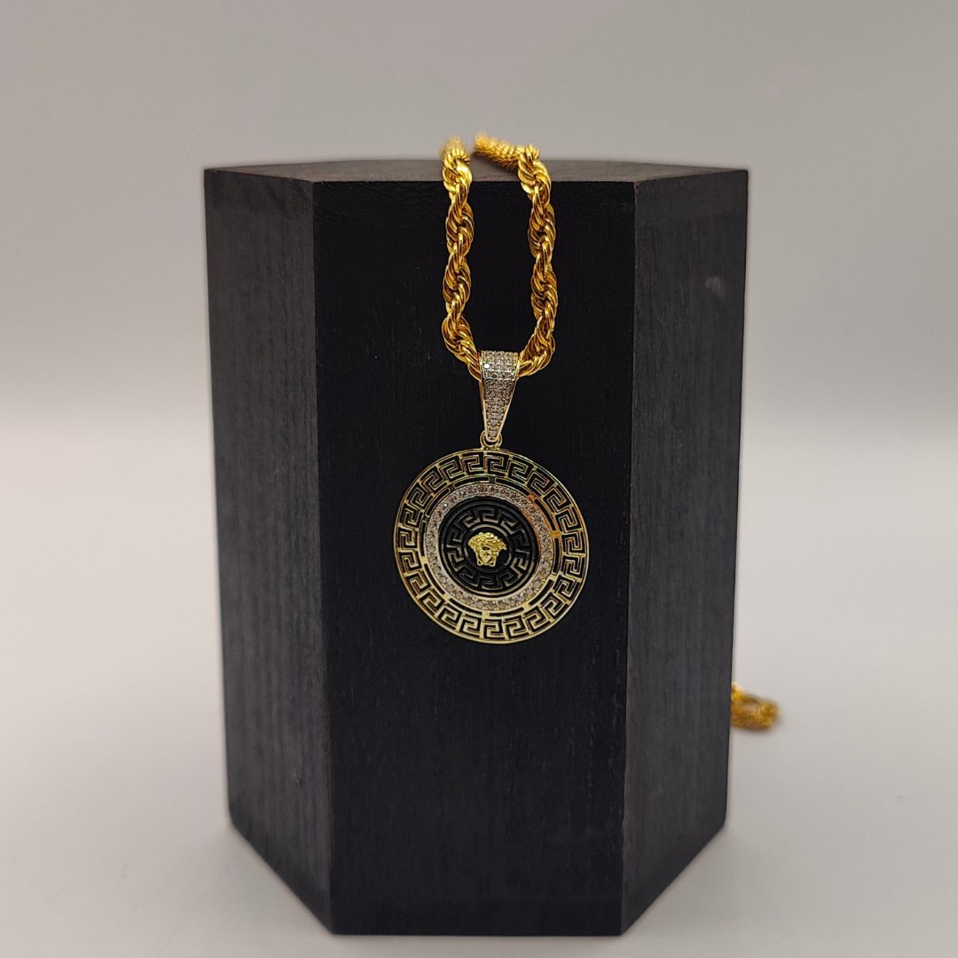 Este impresionante colgante Versace combina circonitas brillantes con un diseño trocado que aporta una textura única y sofisticada. En el centro, destaca la icónica cara de Medusa, símbolo emblemático de la marca, rodeada por detalles de esmaltado negro que crean un contraste elegante y moderno. Fabricado en oro de 18 quilates, el colgante resalta por su lujo y calidad, haciendo de esta pieza una joya que captura la esencia del estilo Versace.