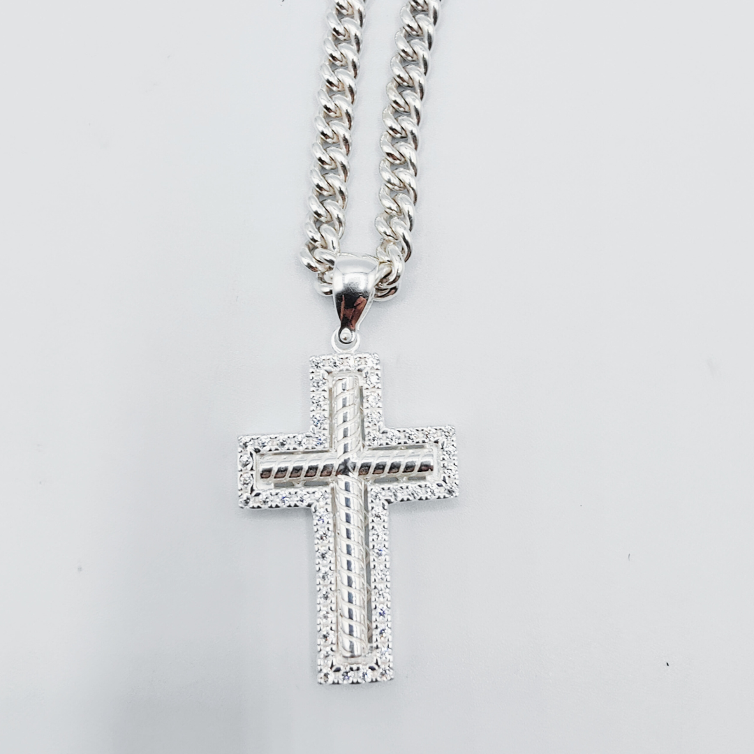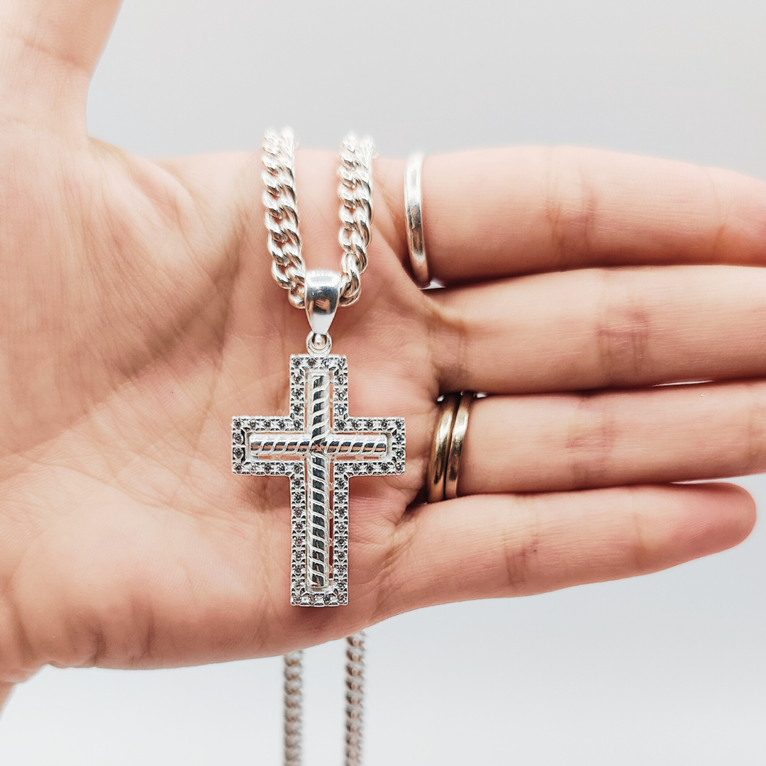 En resumen, este colgante cruz de plata con borde de circonitas es una elección elegante y significativa que agregará un toque de belleza y espiritualidad a cualquier colección de joyas, siendo una pieza versátil que se adapta tanto a la devoción personal como a la expresión de estilo personal.