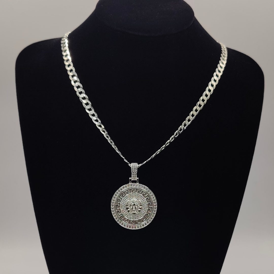 Este colgante de plata, inspirado en el icónico estilo Versace, destaca por su diseño sofisticado y audaz. Recubierto de circonitas brillantes, aporta un toque de lujo y elegancia que captura la luz desde todos los ángulos. Ideal para quienes buscan una pieza de impacto, este colgante es perfecto para ocasiones especiales o para añadir un toque de glamour a tu look diario.