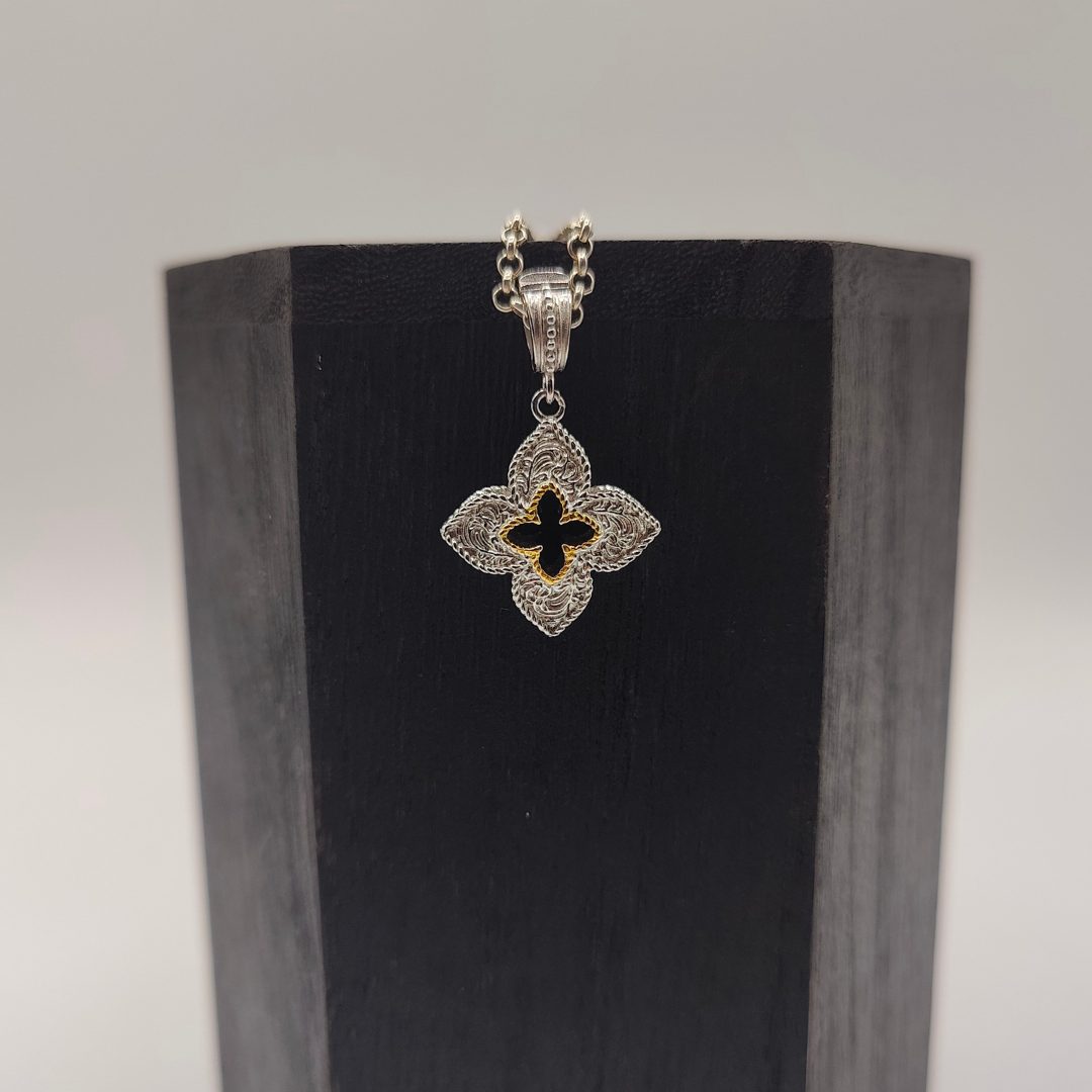 Un diseño floral elegante y lleno de detalles. Este colgante en forma de flor presenta intrincados grabados que resaltan su belleza natural, mientras que un toque sutil de plata dorada añade un brillo cálido y sofisticado. Ideal para aquellos que buscan una pieza única y con un toque especial que combine la delicadeza con la elegancia.