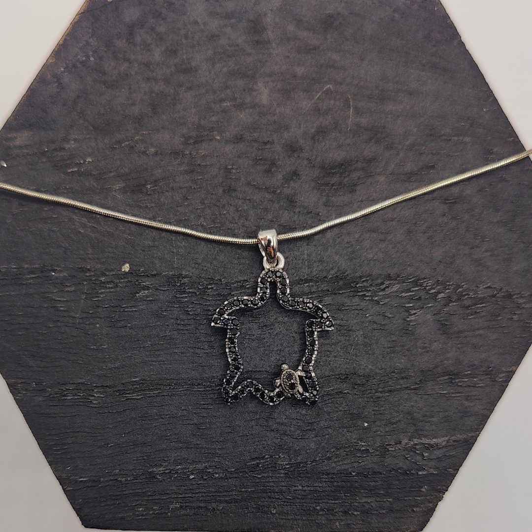 Este colgante presenta una tortuga elegantemente recubierta de circonitas negras que capturan la luz de manera fascinante. A su lado, cuelga una mini tortuga enganchada, también adornada con circonitas negras, añadiendo un toque sutil y encantador. Hecho en plata, esta pieza simboliza sabiduría, protección y longevidad, combinando un diseño moderno con un toque de elegancia que resalta la belleza de cada detalle.