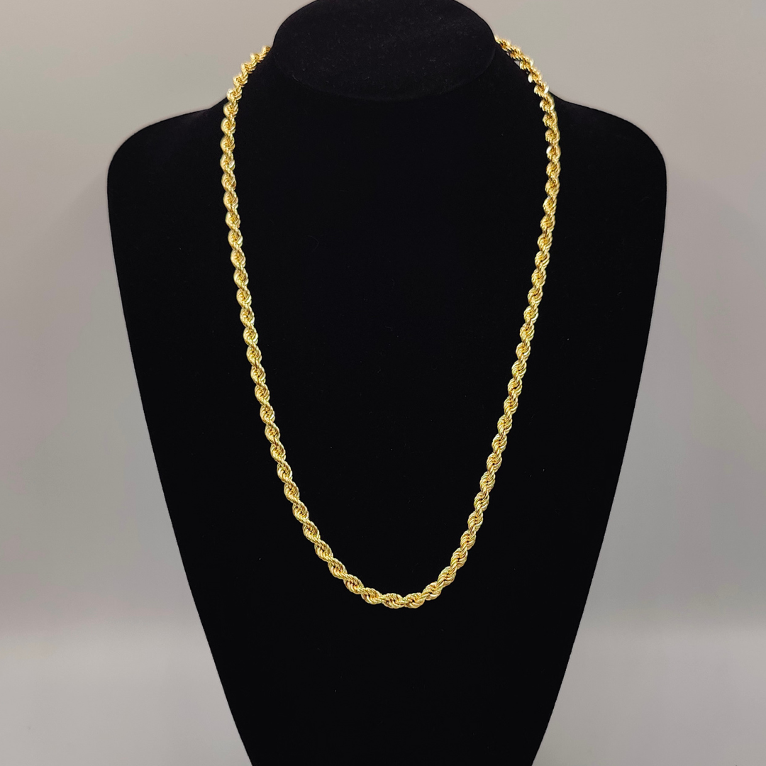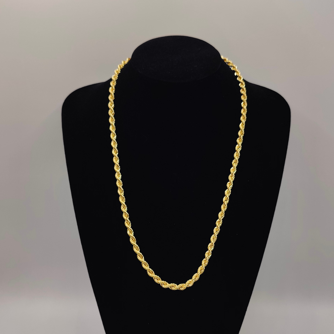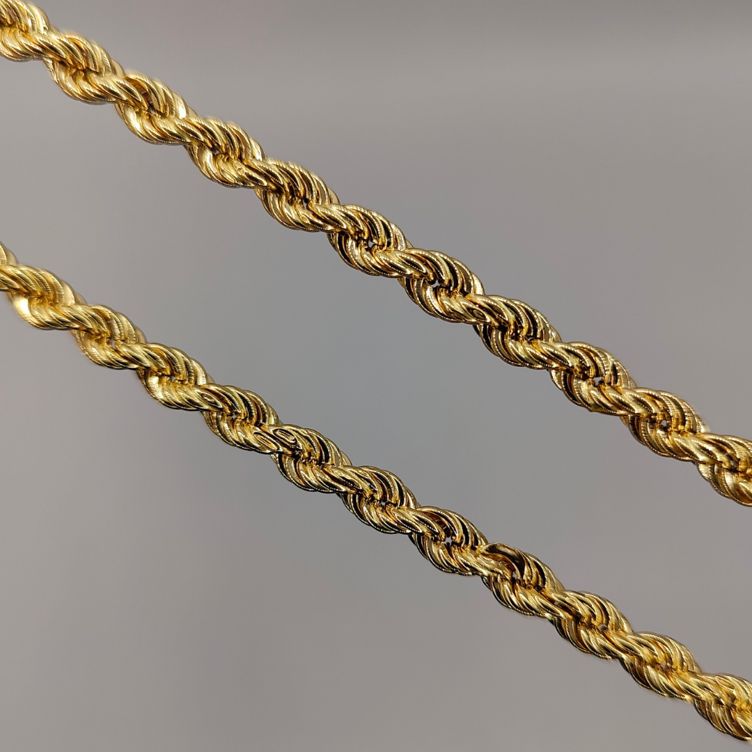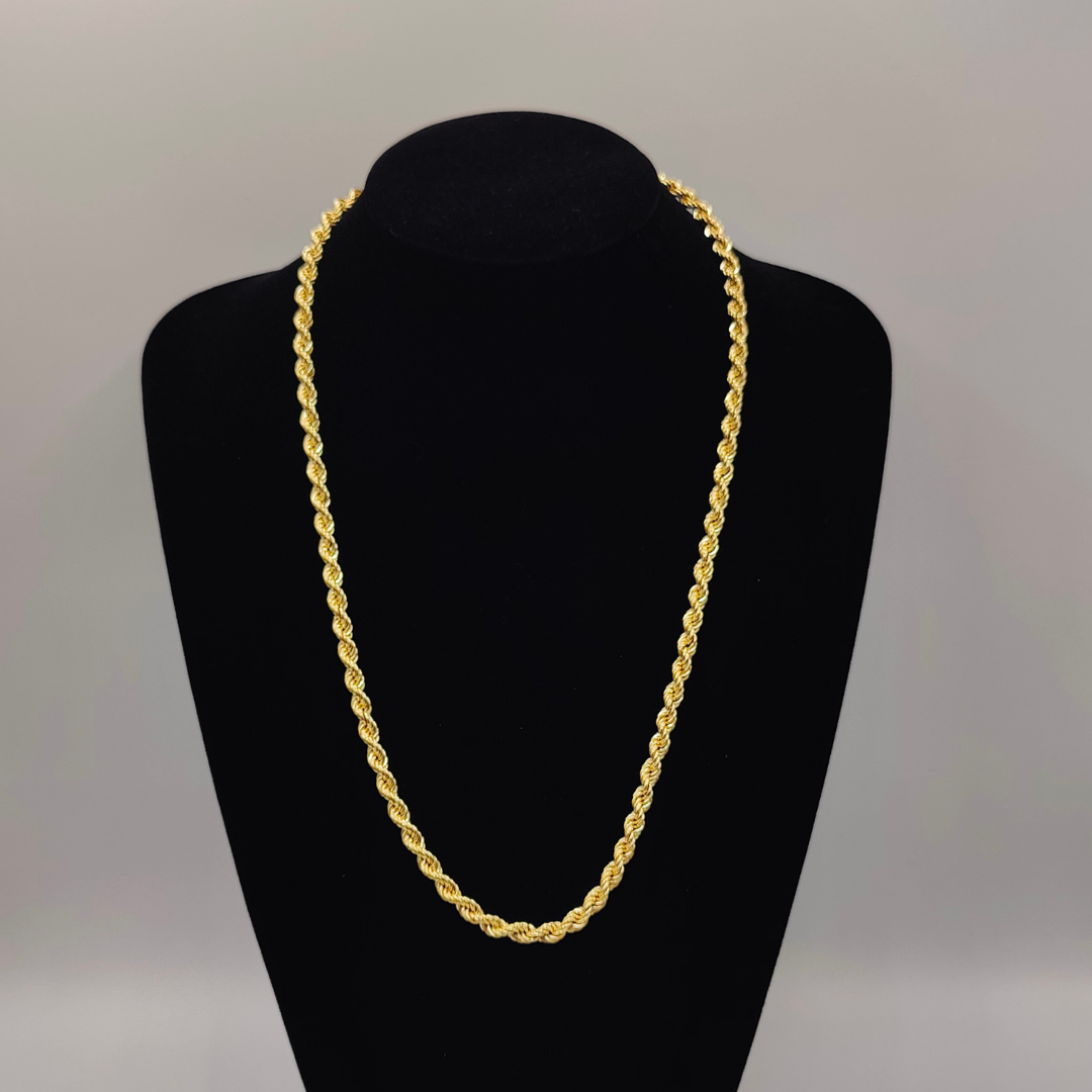 La cadena estilo cordón de 55 cm en oro de 18 quilates, con un grosor de 6 mm, es una joya clásica y robusta que destaca por su diseño trenzado y su presencia llamativa.